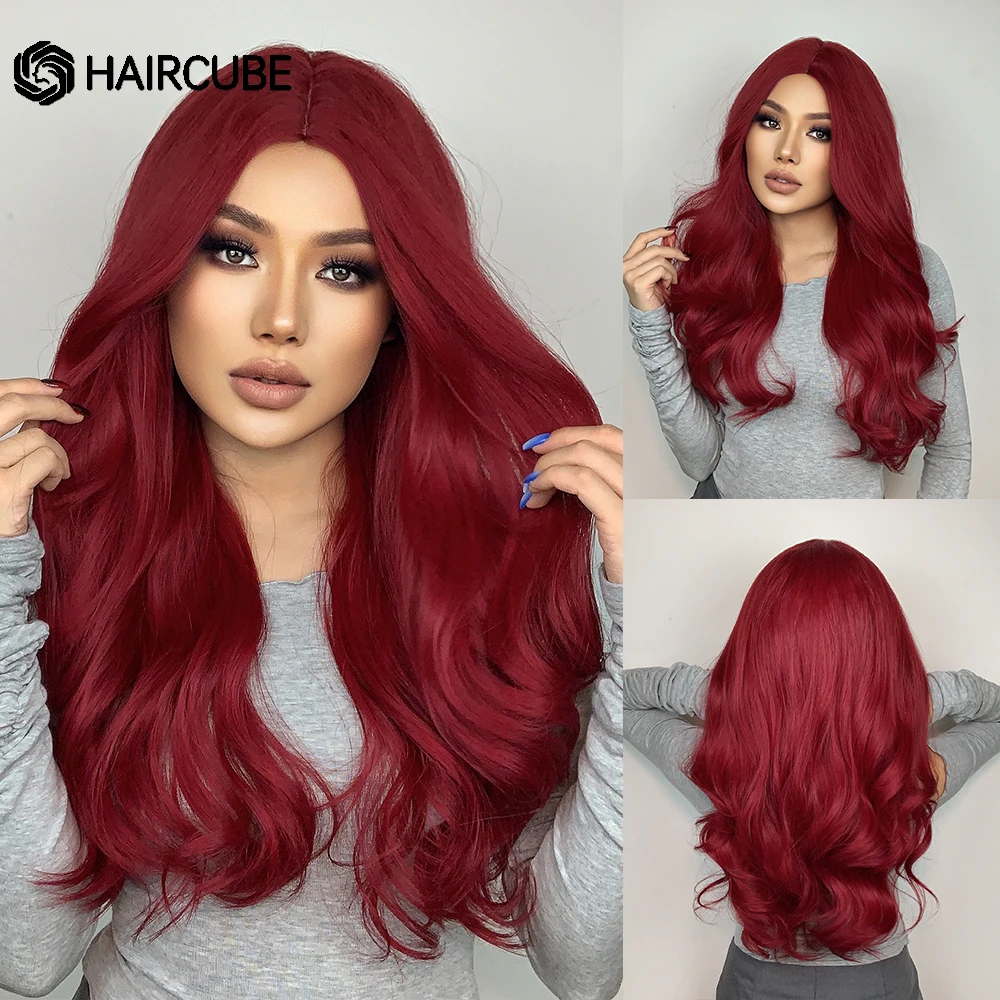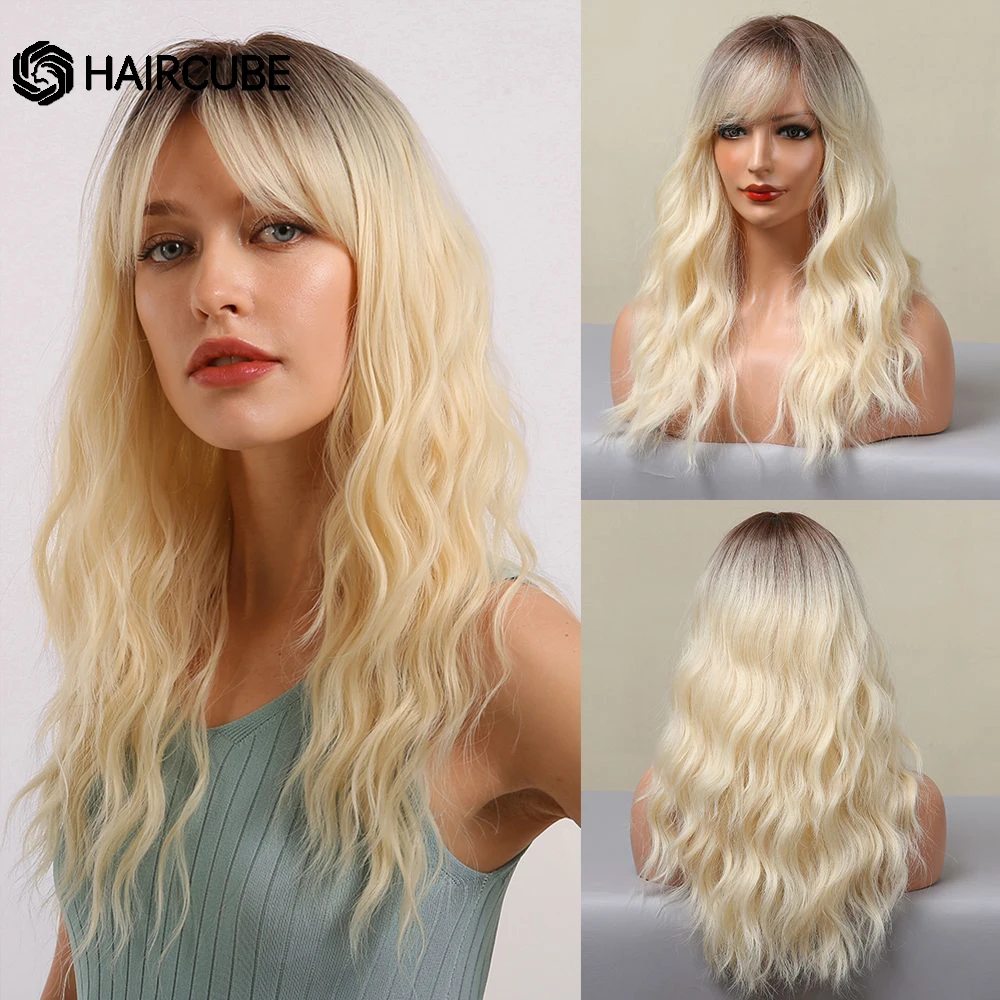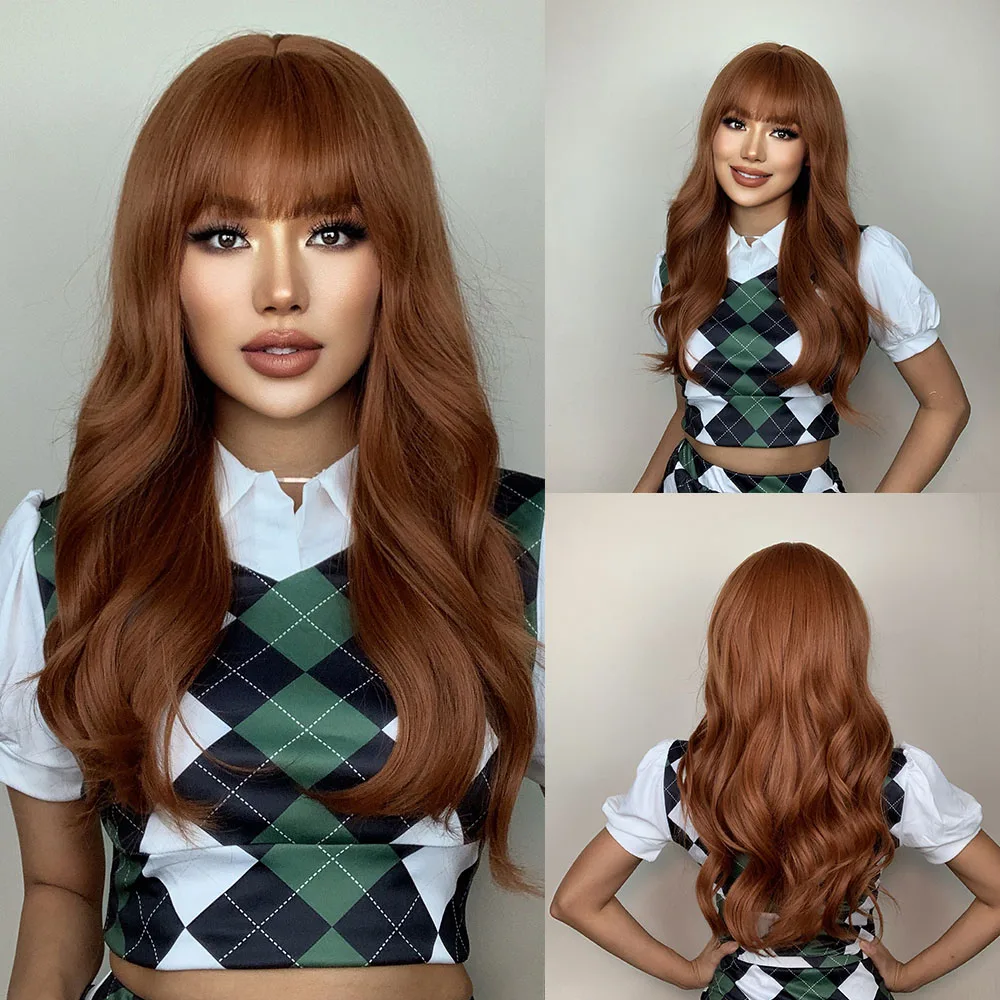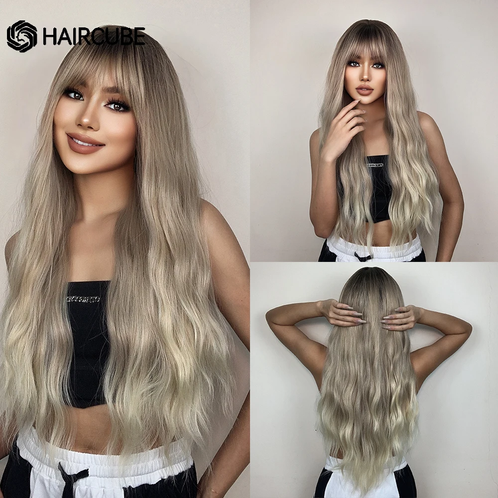HAIRCUBE Long Wavy Brown Highlight Synthetic Wigs for Black Women With Bangs Natural Hair Daily Party Heat Resistant Fiber Wigs