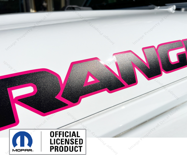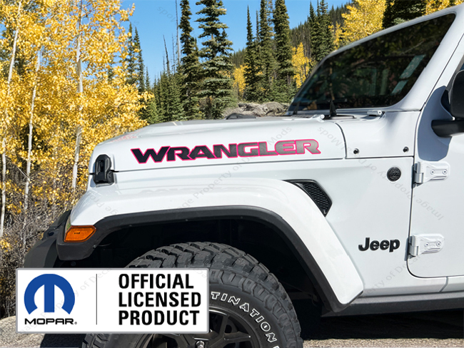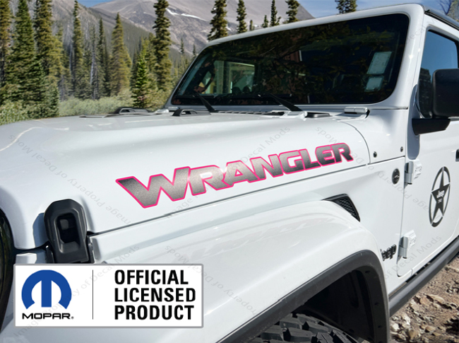 This set includes the following: - Set of 2 - WRANGLER hood decals (Part number: UV1R1). - Decals are in the color: Hot Pink outline, Matte Black fill - Installation Instructions |