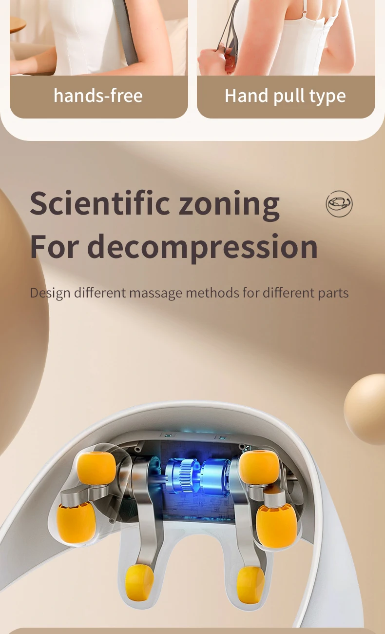 1.Trapezius massager. Using bionic massage,bi-directional clamping & kneading, and constant temperature hot compress, the massage action can deeply relax your muscles