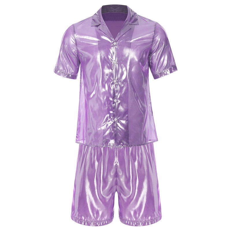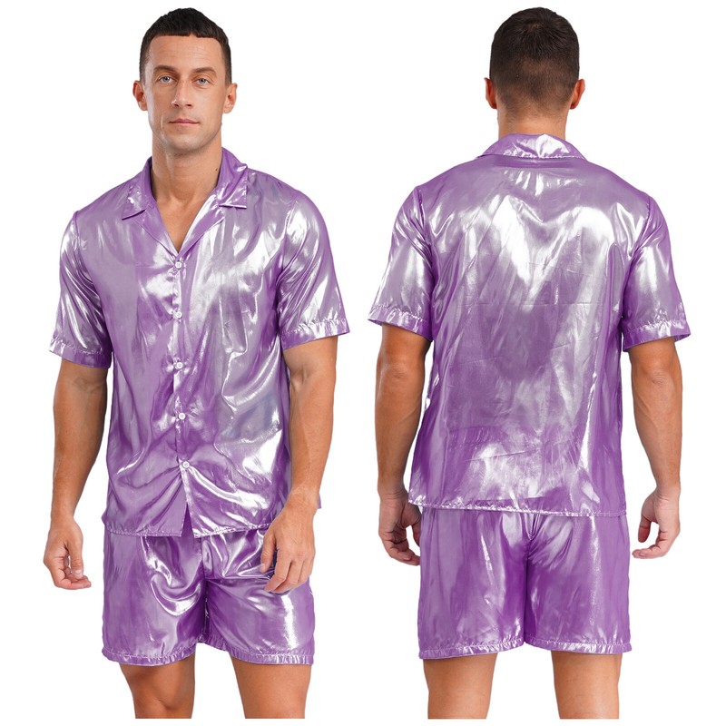 Mens Short Sleeve Lapel Button Down Shiny 2 Piece Outfits Party Clubbing Summer