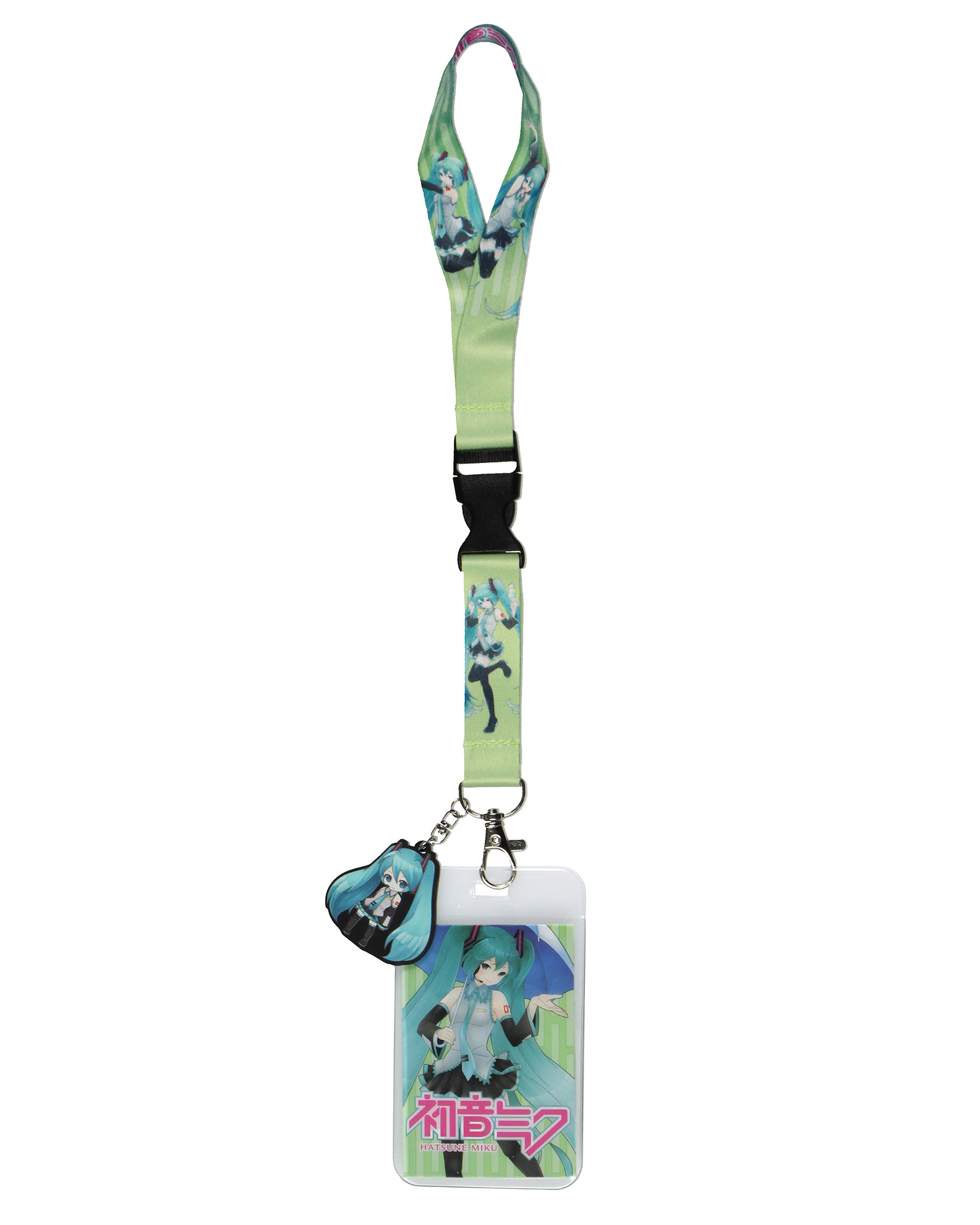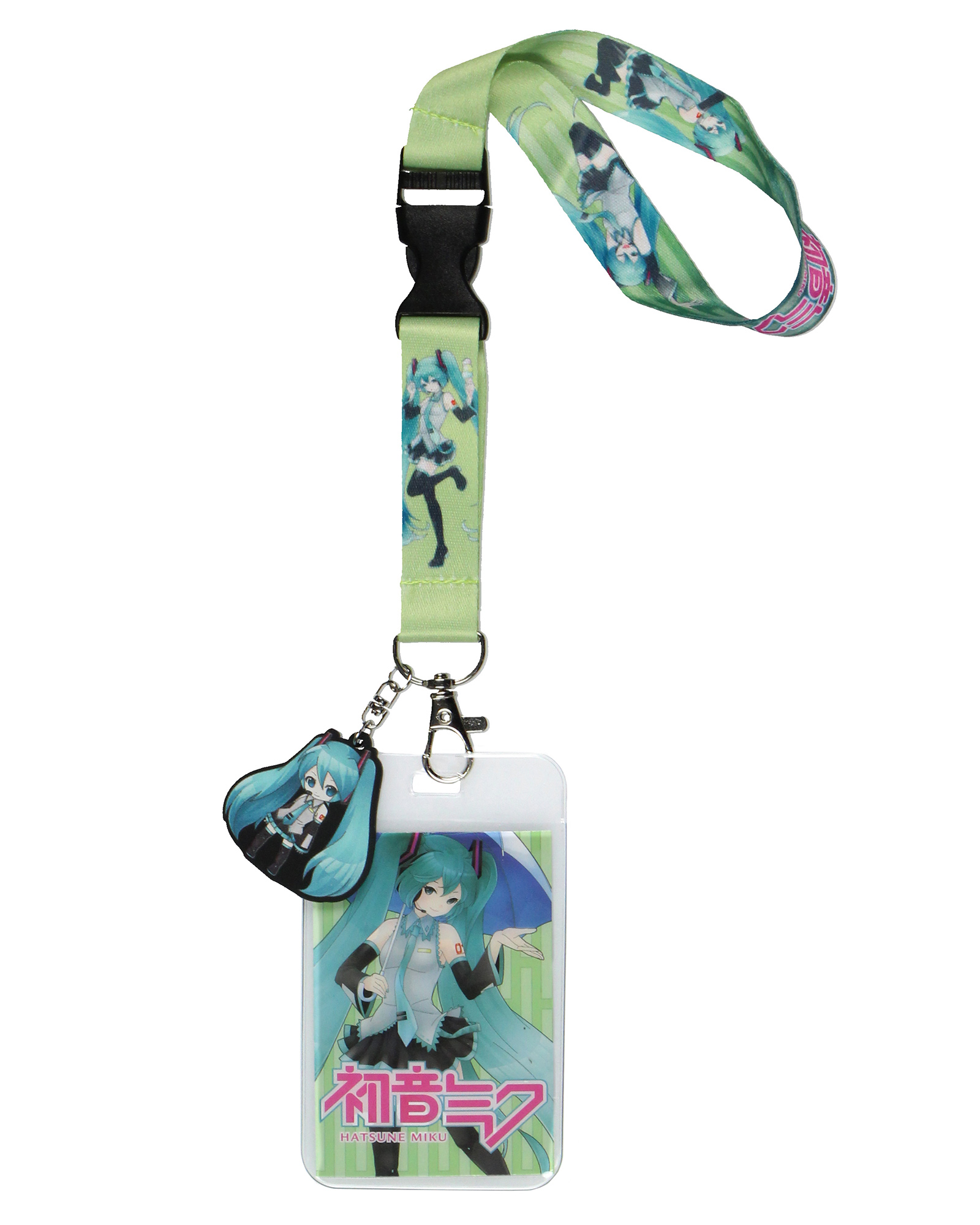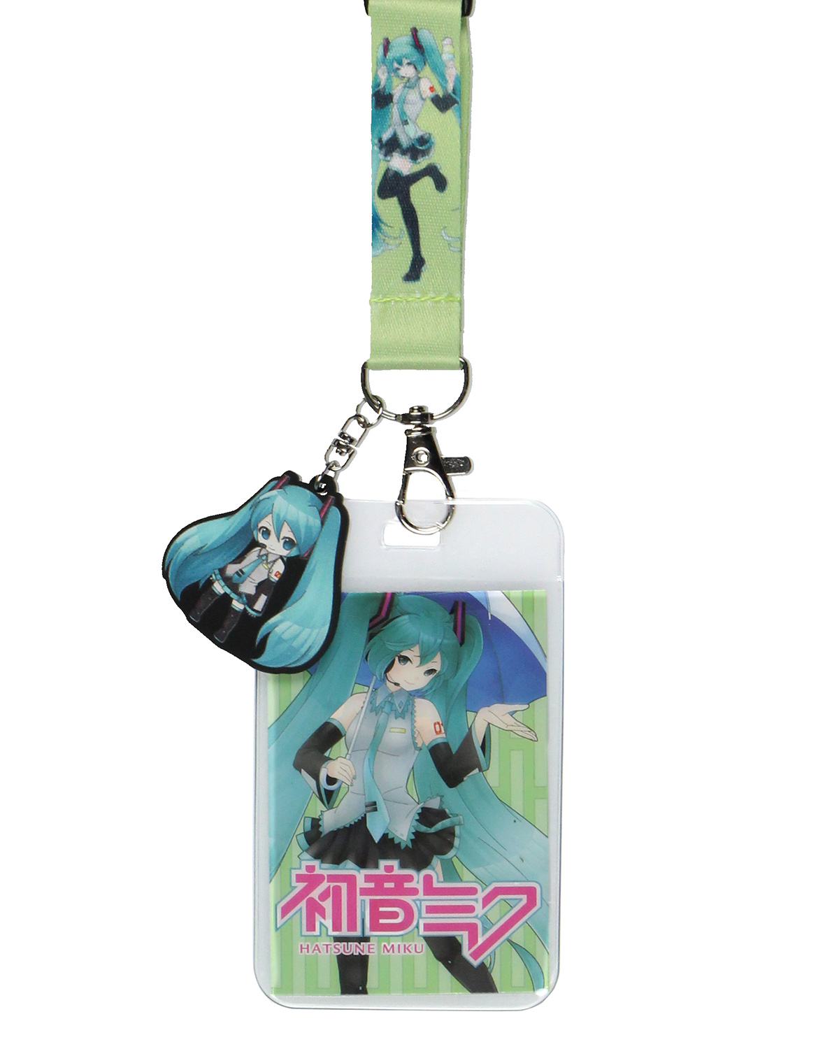 Hatsune Miku Accessories – The lobster clip attachment includes a clear ID badge holder and character card of Hatsune Miku holding an umbrella, adding a unique element whether for everyday use or as part of your Hatsune Miku cosplay accessories