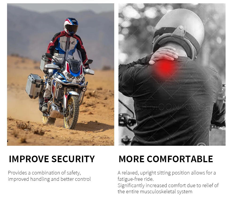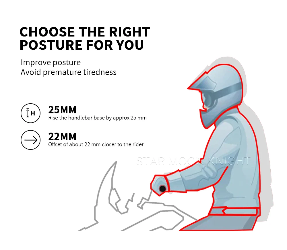 This high-quality handlebar riser with offset is fitted precisely between the fork bridge and the handlebar clamp. The higher and, at the same time, set-back handlebar position results in a more relaxed seating position and a more direct riding experience. In addition, customers report that the more comfortable seating position makes it possible to stand upright in the terrain without tiring. Falling asleep hands are also a thing of the past. The design is unobtrusive and fits in visually with high quality. Assembly is easy. This handlebar offset can be used with all Scrambler handlebars (except stubs). Standard handlebars with 22.2mm Ø, handlebars with 28.6mm Ø and high handlebars.