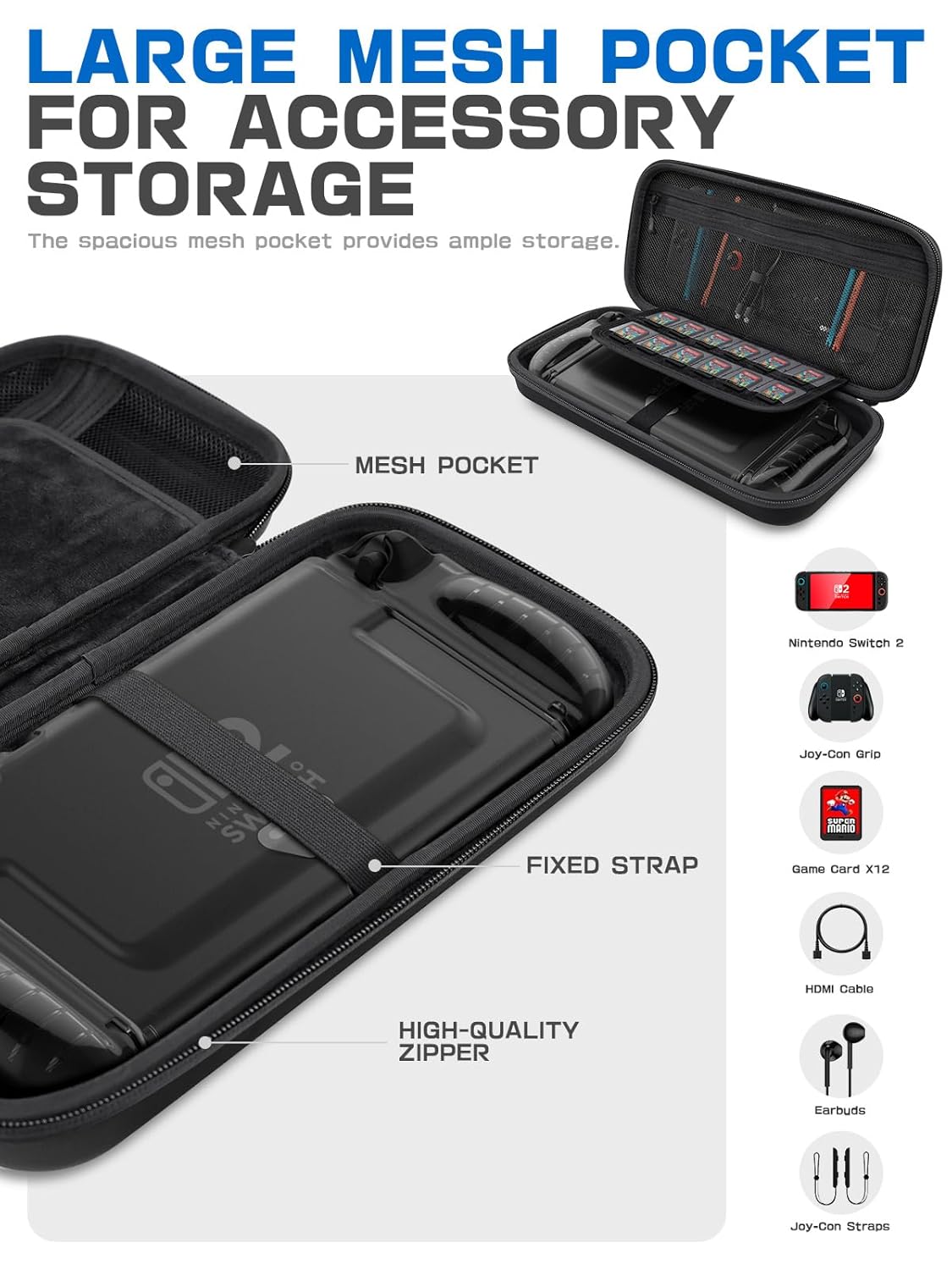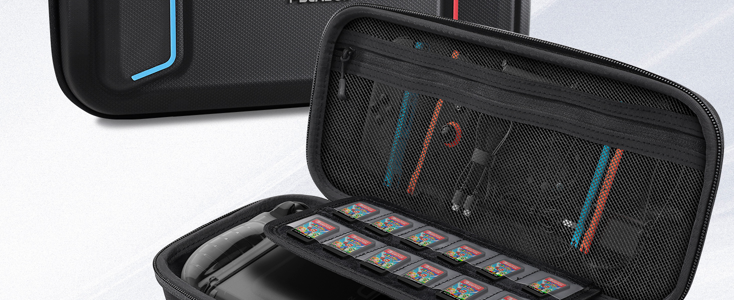 【Secure & Organized Storage System】Anti-slip elastic strap secures Switch console during travel and includes 12 game card slots. A scratch-resistant zippered mesh pocket holds Joy-Con controllers, earbuds, cables, and other accessories.