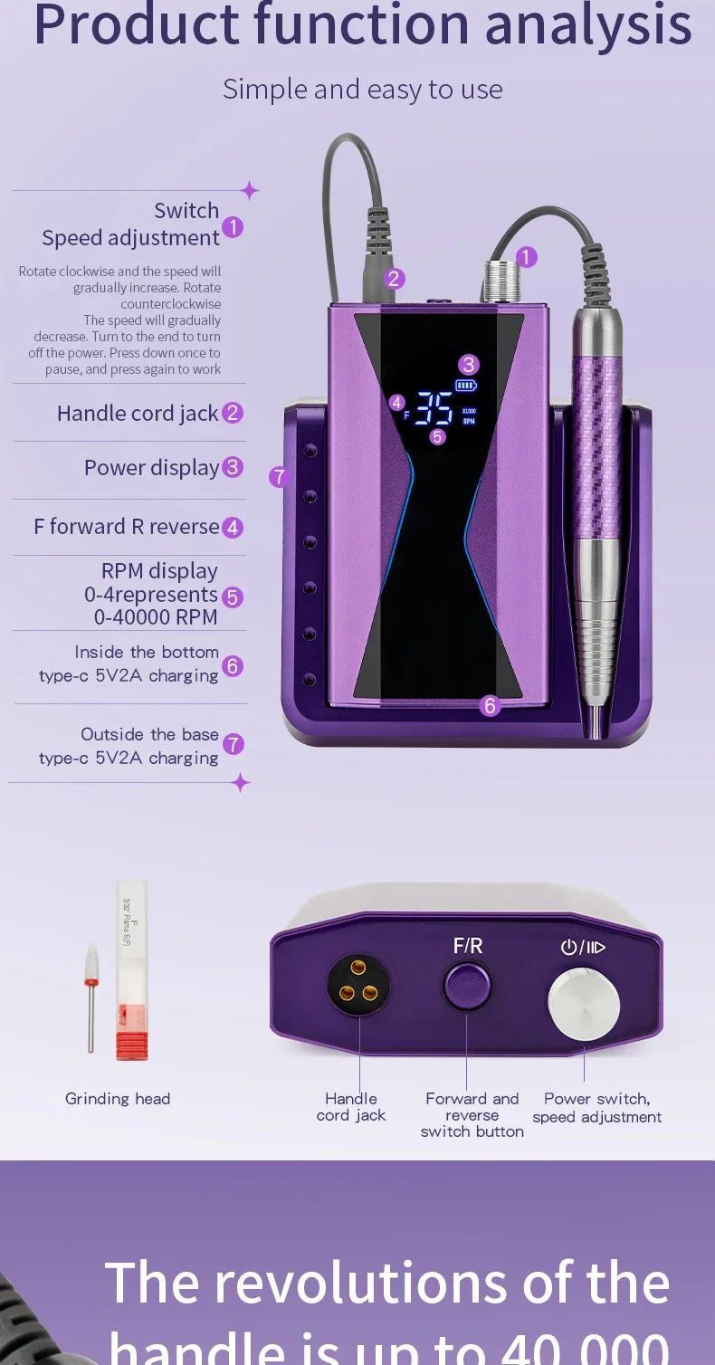 This electric nail drill combines power, efficiency, and style, ensuring a professional nail care experience at home or in the salon.