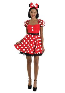 No Magic RequiredMinnie Mouse has been setting fashion trends since 1928. Shes timeless, adorable, and somehow always manages to look effortlessly put-togethereven while running around with Mickey and causing cartoon chaos. Now, with this Womens Minnie Mouse Costume, you can step into her signature style with a look thats playful, classic, and almost too cute to handle. No cartoon physics or talking animals required.Product DetailsThis officially licensed costume features Minnies signature red dress, complete with charming details that make it instantly recognizable. The short skirt adds a fun and flirty touch, while the jewel bust-style bodice keeps it classic. Puffy shoulder sleeves with white polka dots give it that true Minnie Mouse feel, and the attached black belt ties the whole look togetherbecause even a cartoon icon appreciates good accessorizing.Of course, no Minnie outfit would be complete without her famous ears and bow. The included headband features two round mouse ears and a bright red bow with white polka dots, bringing that perfect mix of sweet and sassy