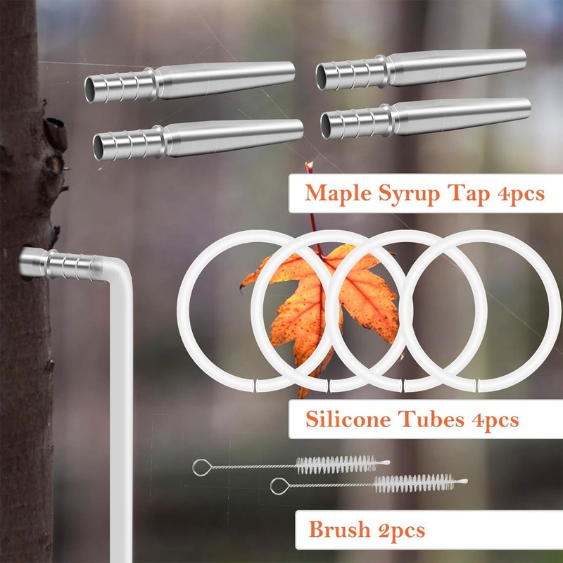 Set Include: 4Pcs Stainless Steel Maple Tree Taps, 4Pcs Food Grade Tube, 2Pcs Cleaning Brushes