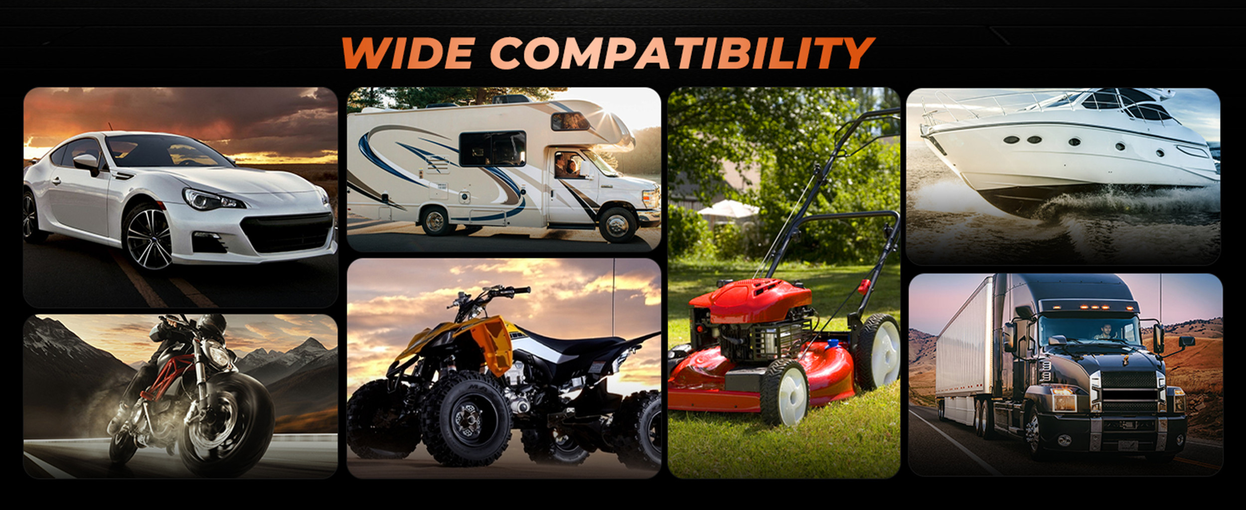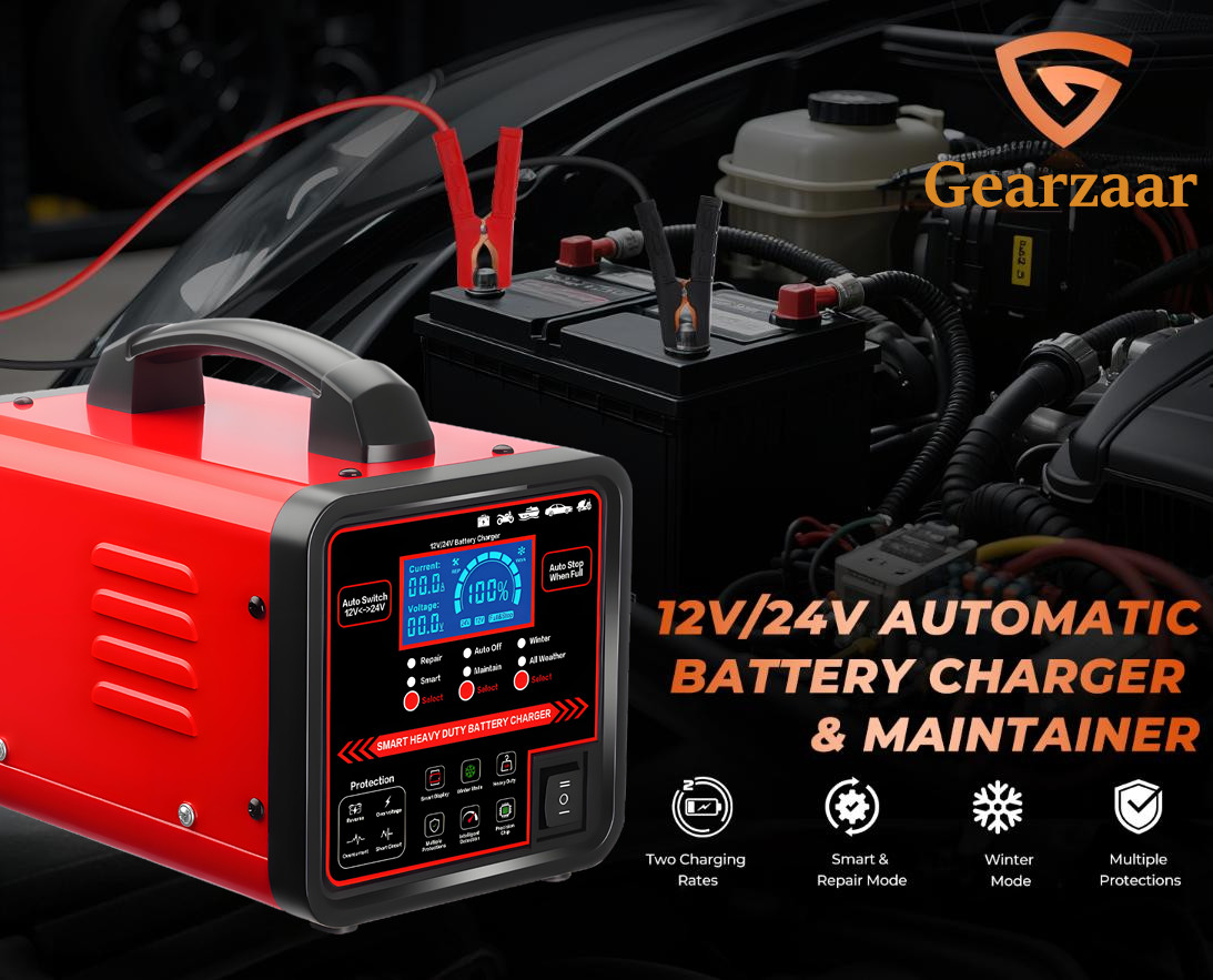 【Heavy Duty Battery Charger】This smart battery charger features a durable metal outer frame combined with a high-strength ABS plastic housing, offering both protection and portability. Weighing 13.2 lbs, it's built to withstand tough garage conditions while remaining easy to handle. Compatible with all 12V and 24V lead-acid batteries—AGM, GEL, Wet (Flooded), EFB, Calcium, MF, and deep-cycle. Perfect for charging cars, trucks, motorcycles, RVs, ATVs, and lawn mowers.