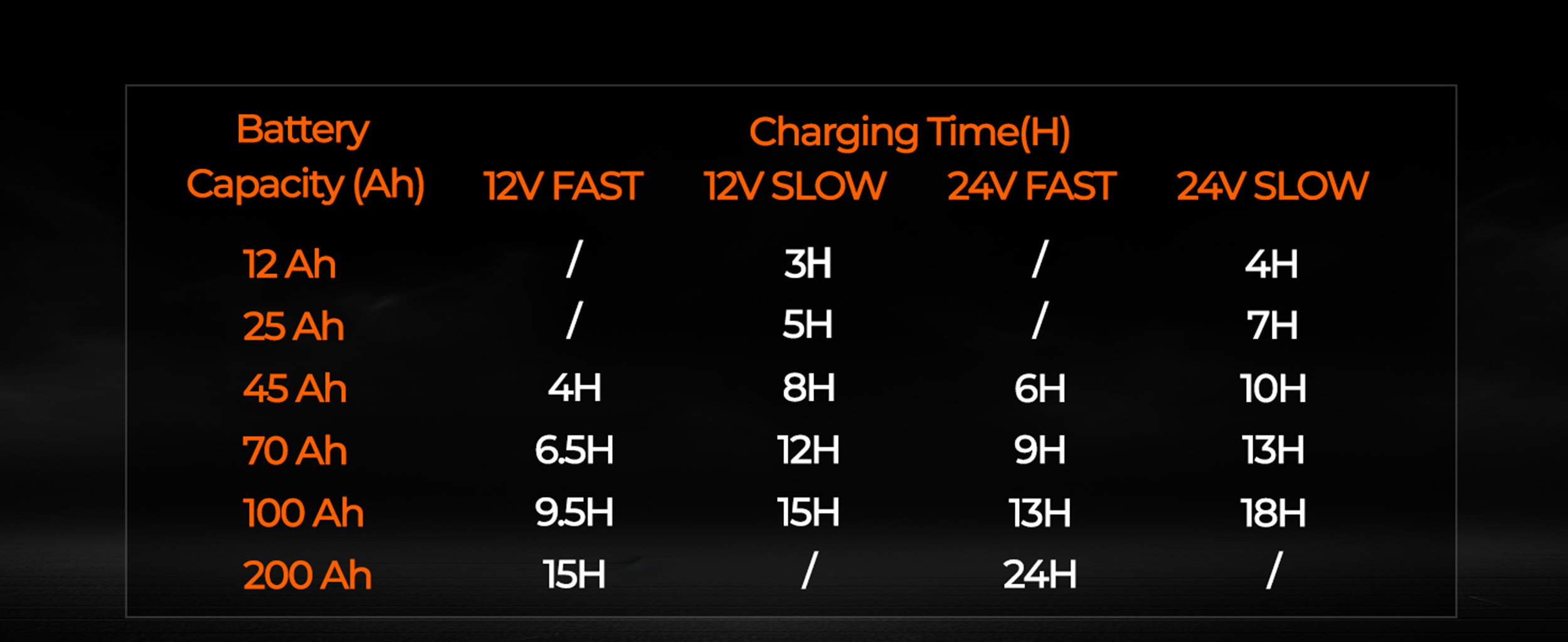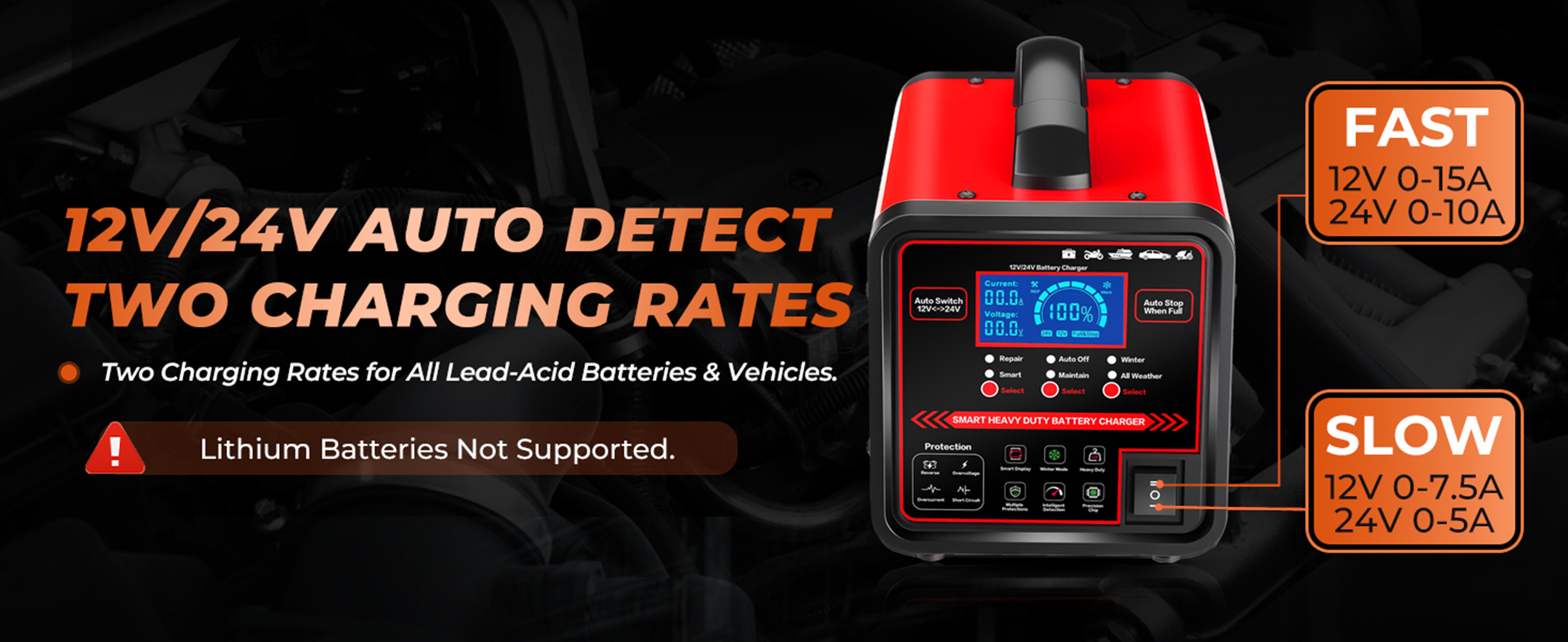 【Smart Dual-Mode Charging – Fast or Trickle】Automatically detects 12V or 24V batteries and adjusts charging accordingly. With a 0–15A output and support for up to 400Ah, this charger offers both rapid charging to revive dead batteries and trickle mode to maintain long-term battery health—just connect it and let it do the work.