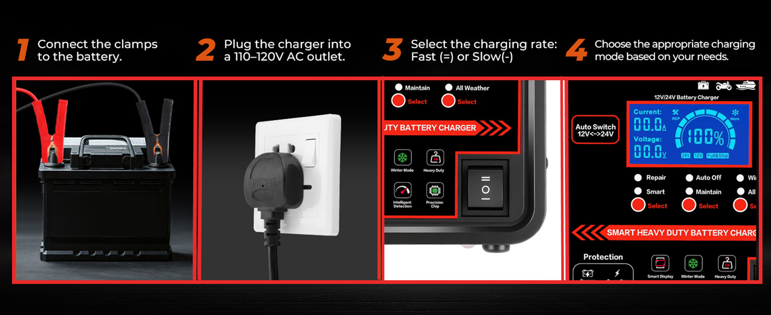 【Winter / All-Weather Mode】In cold weather, the winter mode delivers a complete charge to ensure a strong engine start. The all-weather mode is designed to provide reliable charging performance in any climate, adapting to temperature changes for consistent battery care. The easy-to-read LCD display shows charging percentage, current, and voltage for precise, safe, and efficient charging all year round.
