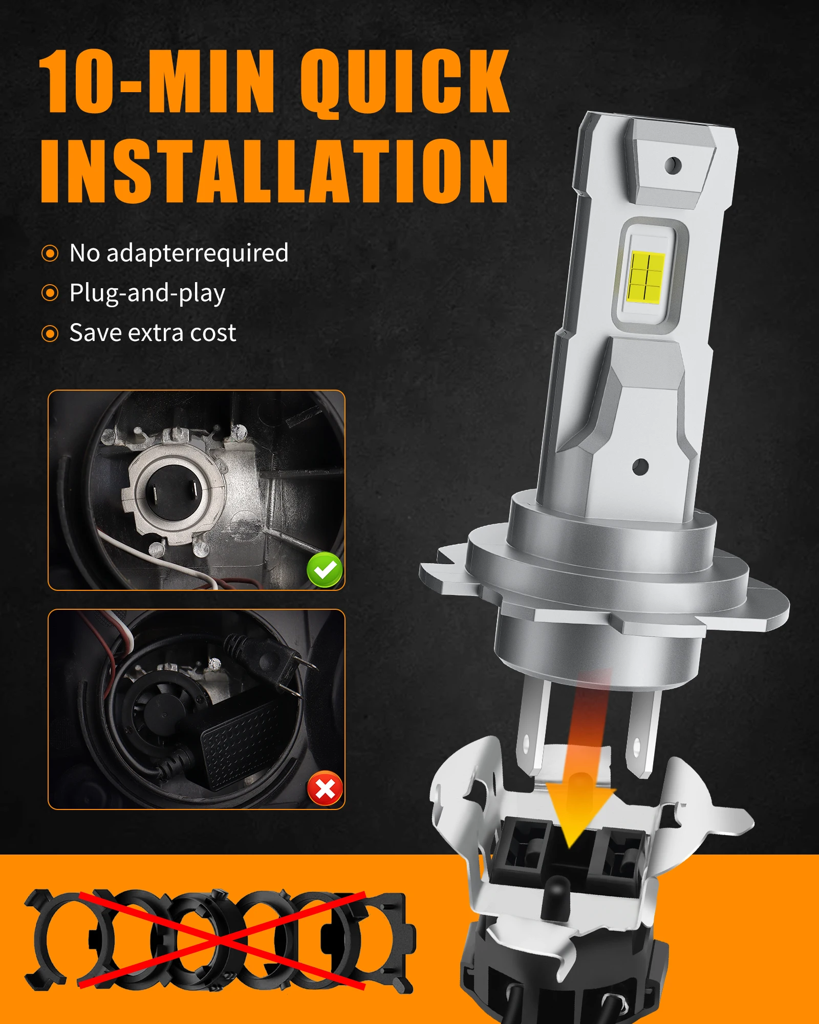 Plug and Play , easy to Install. Don't need the extra adapter to install the H7 bulb.