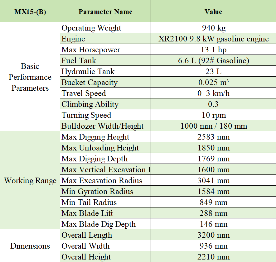 MX15-B is an ultra-compact gasoline-powered mini excavator designed for narrow spaces and small engineering operations. Its light weight body (working weight is only 900kg) and flexible size (length 2882mm × width 962mm × height 2219mm) make it suitable for a variety of scenarios such as garden renovation, gardening construction, indoor demolition, pipeline laying, etc. Equipped with a 0.025m³ bucket and B&S XR2100 gasoline engine (9.8kw power), it is environmentally friendly and low-noise, suitable for use in cities and residential areas.