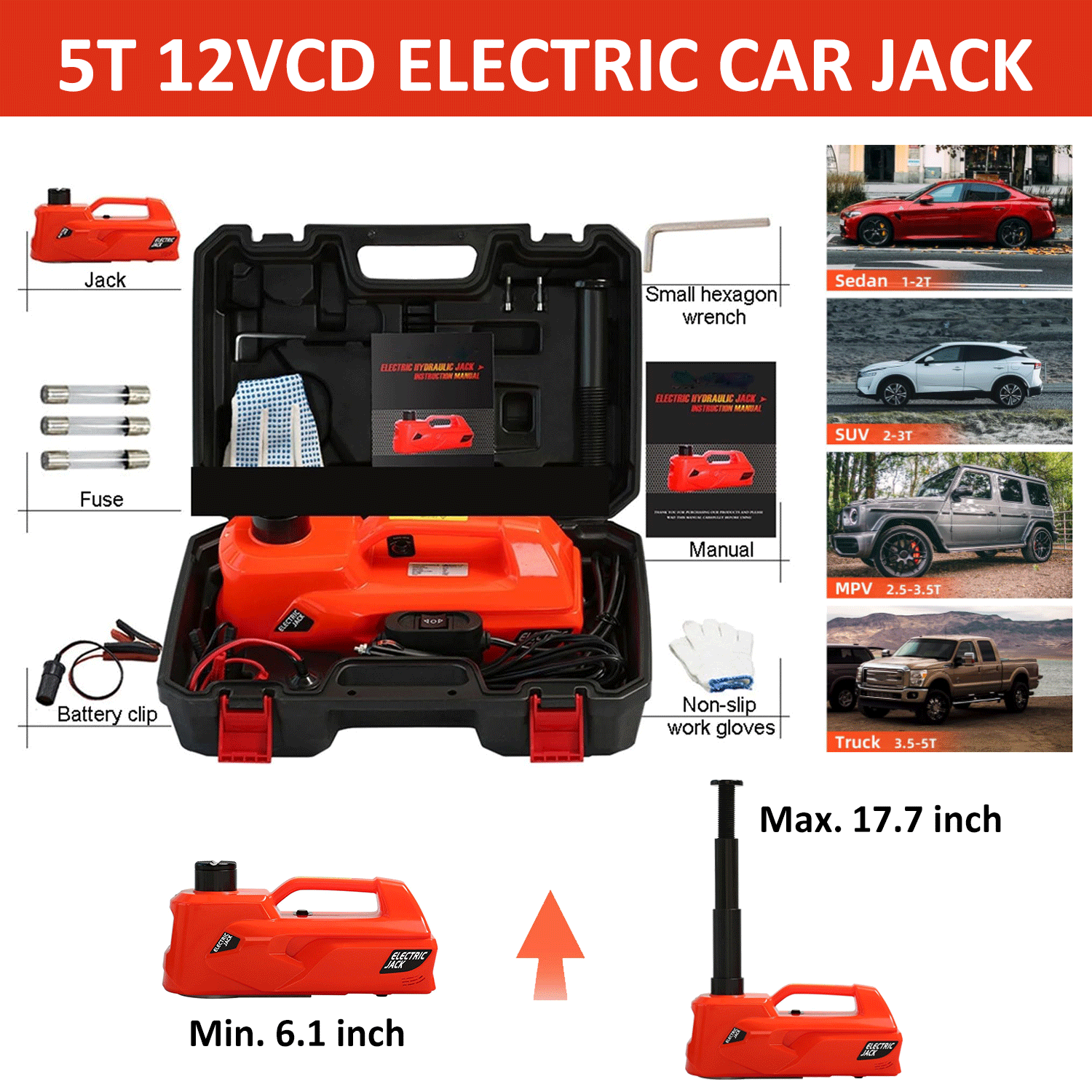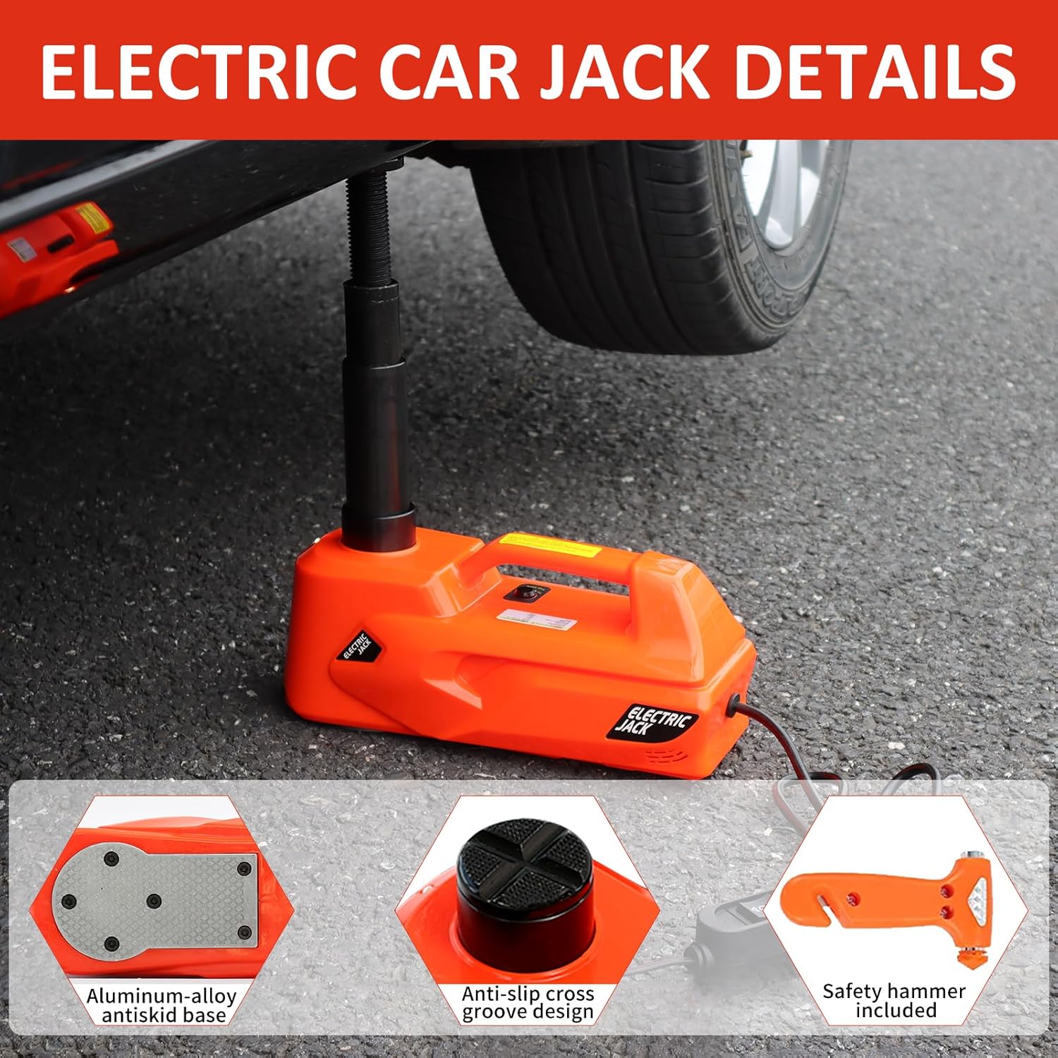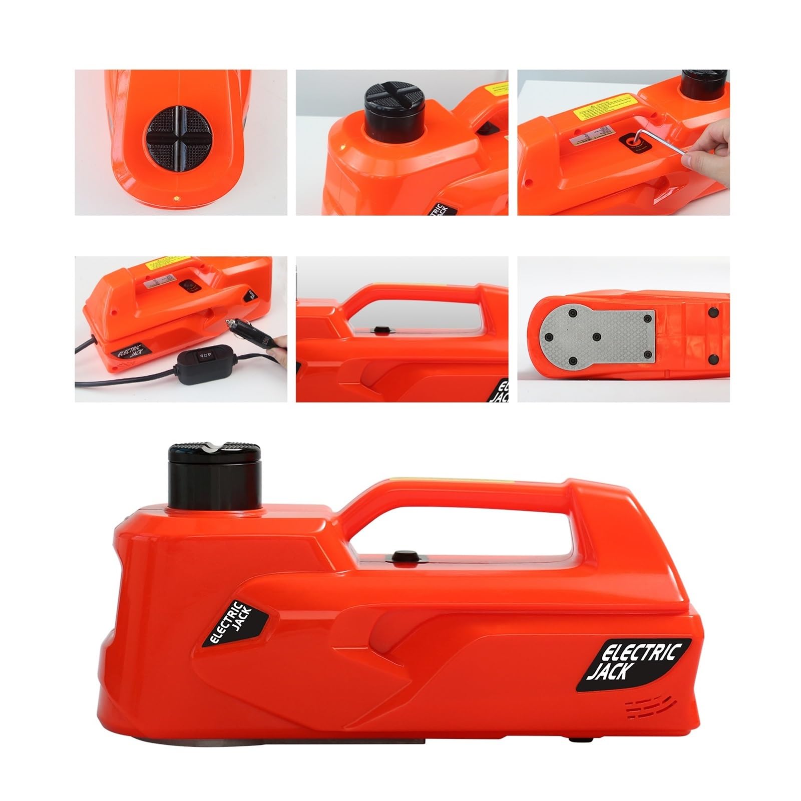 [Powerful Electric Car Jack] E-HEELP hydraulic electric car jack has the capability to quickly lift a weight of 5 tons(11200 lbs) in just 2 mins. The Emergency car kit offers two power options: cigar lighter and car battery, which are matched to most high-power engines.