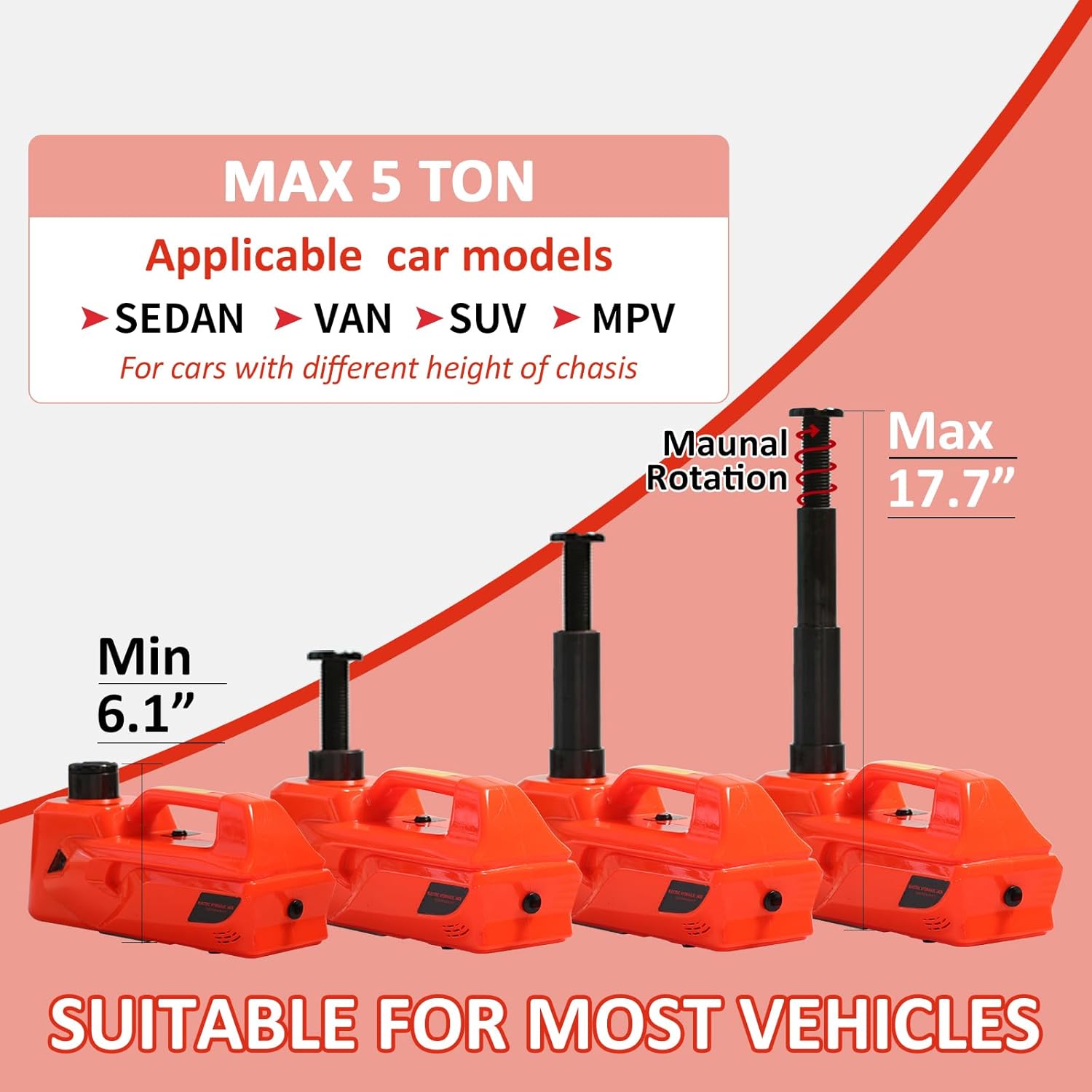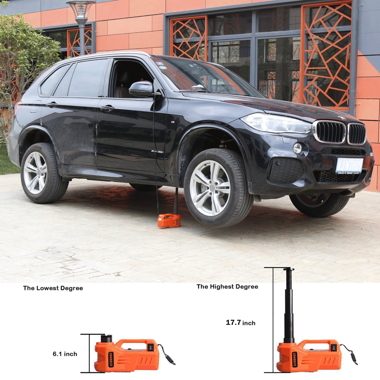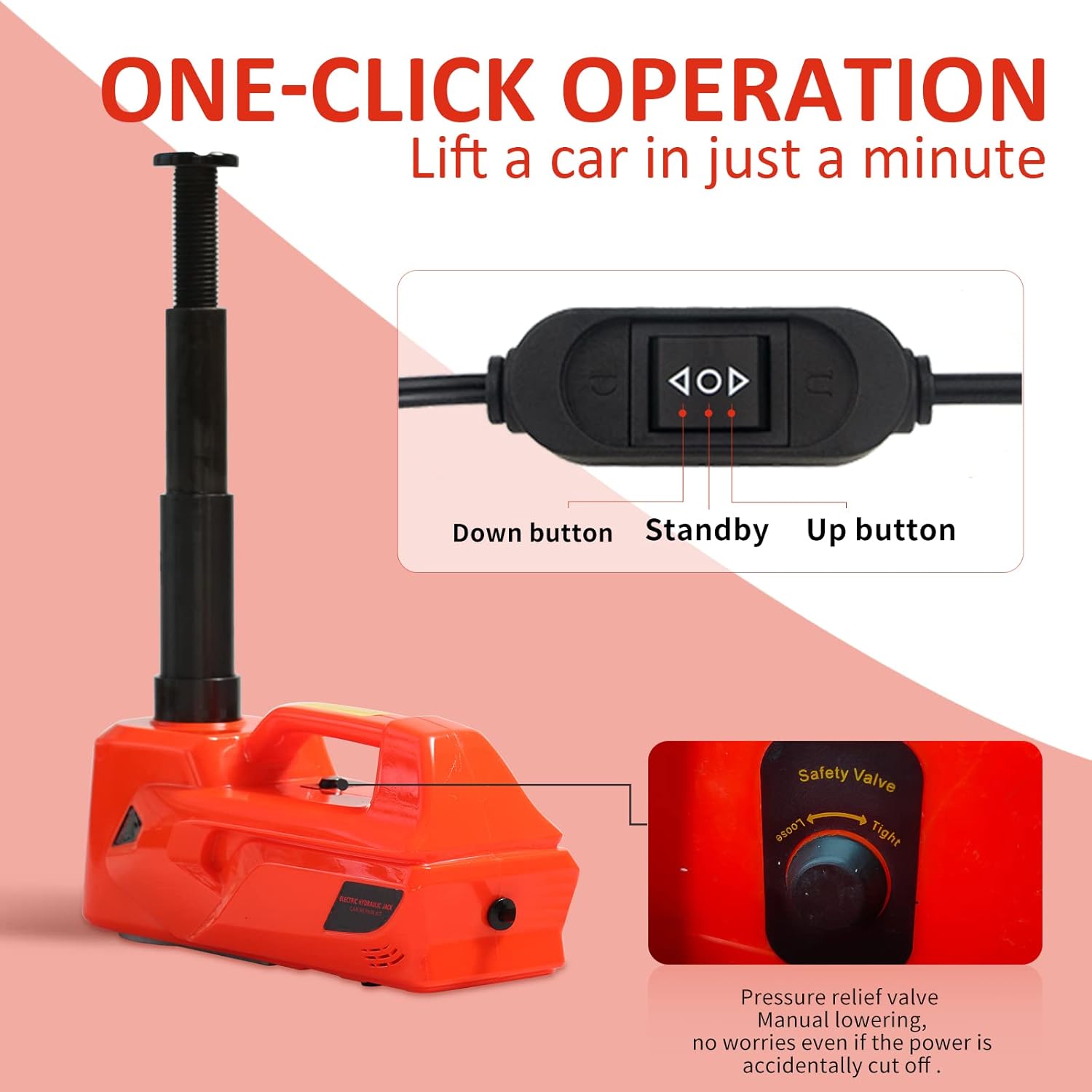 [Powerful Electric Car Jack] E-HEELP hydraulic electric car jack has the capability to quickly lift a weight of 5 tons(11200 lbs) in just 2 mins. The Emergency car kit offers two power options: cigar lighter and car battery, which are matched to most high-power engines.