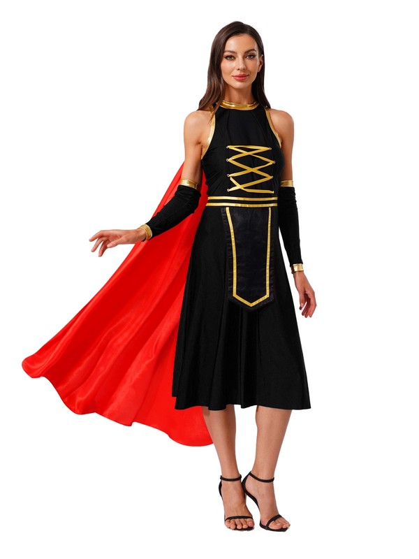 The included satin cape and cuffs enhance the Roman gladiator theme, giving the costume an authentic and complete appearance.