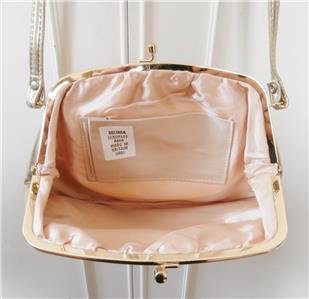 This is a lovely little bag in good, lightly-used condition, made out of a shimmering, gold vinyl! The bag has a gold metal frame, a kiss-clasp, and a narrow, self-fabric shoulder strap. Most bags of this time were smaller and only had a carry chain or handle, so it's unusual to find a larger one with a longer strap for the shoulder. The bag opens to reveal a peach taffetta lining, with an open pocket, showing minimal use. The outer is clean, with just a couple of age spots on the back. It's a lovely bag, which is otherwise in excellent condition and has years of wear left in it! Perfect as that 'something old' for a Bride!