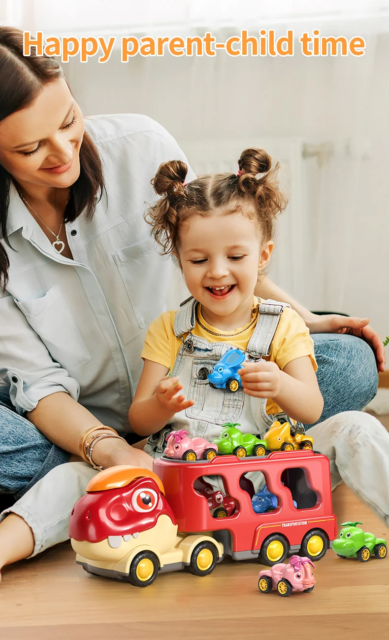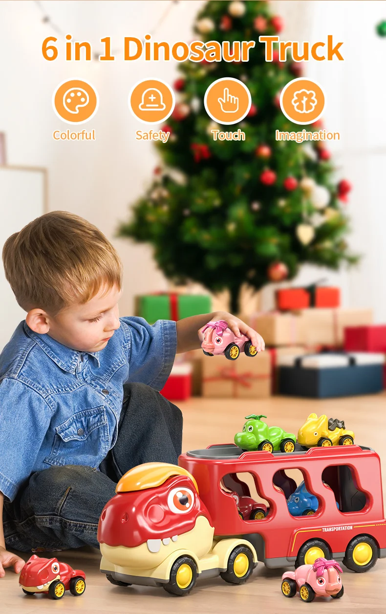 Eye Catching Colors: Dinosaur cars are vivid color, uniquely designed, and super cute. The big dinosaur truck toy includes 5 colorful miniature cartoon pull back dinosaurs cars.