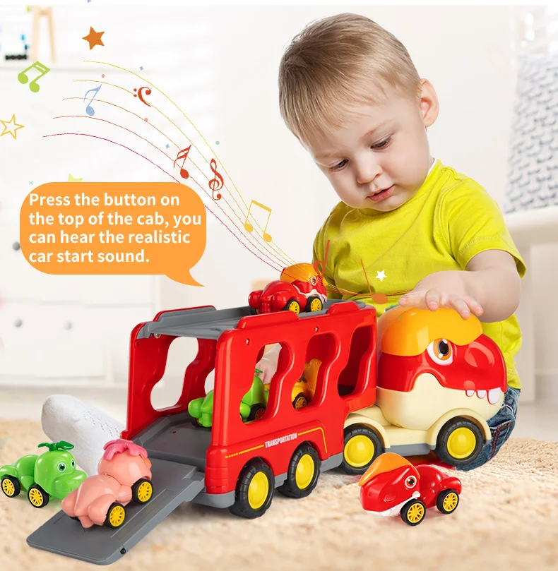 Easy to Play: Just push and go, and the truck will set off with the dino cars! The head of the large carrier can also be turned, and open the tailgate to transport the dino cars down.
