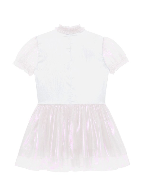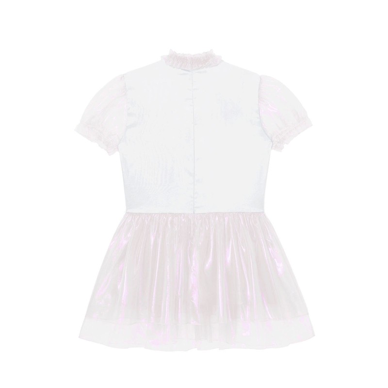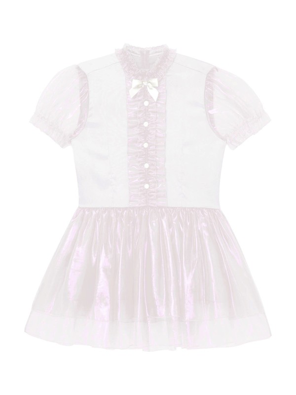 Designed with ruffled detail at collar, cuffs and front, and bow to add cuteness and femininity. Three layers dress look puffy.