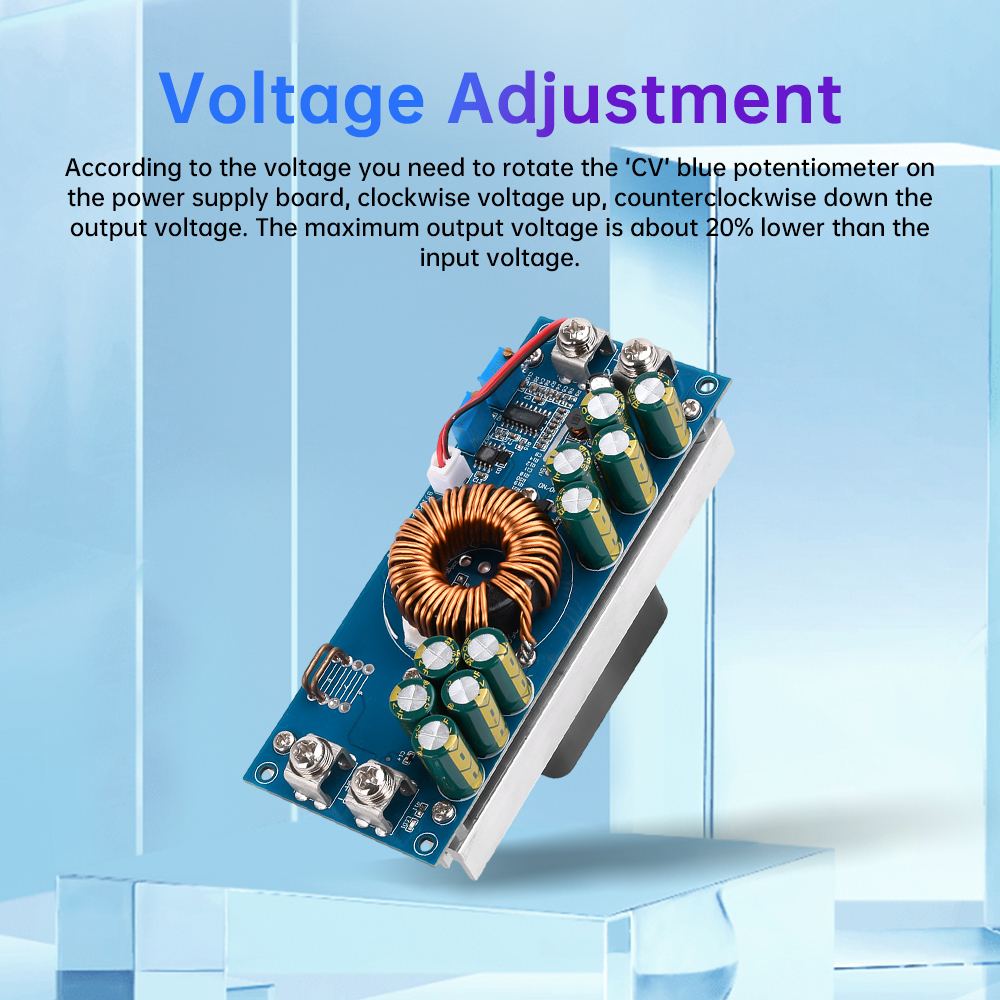 Voltage adjustment: according to their own required voltage rotating power board “CV” blue potentiometer, clockwise voltage up, counterclockwise down the output voltage. The maximum output voltage is about 20% lower than the input voltage