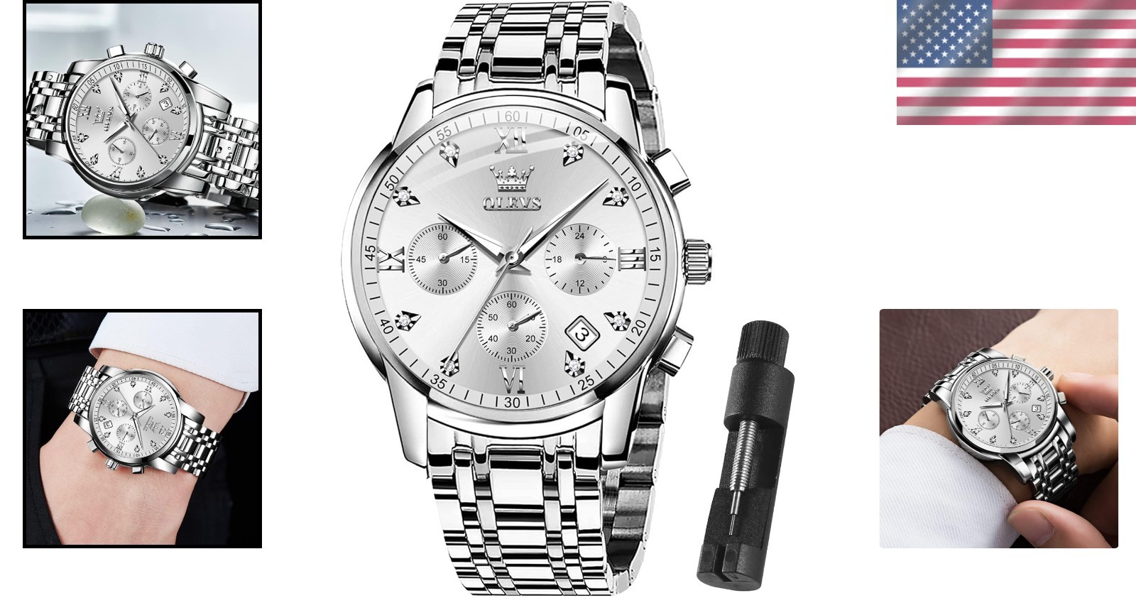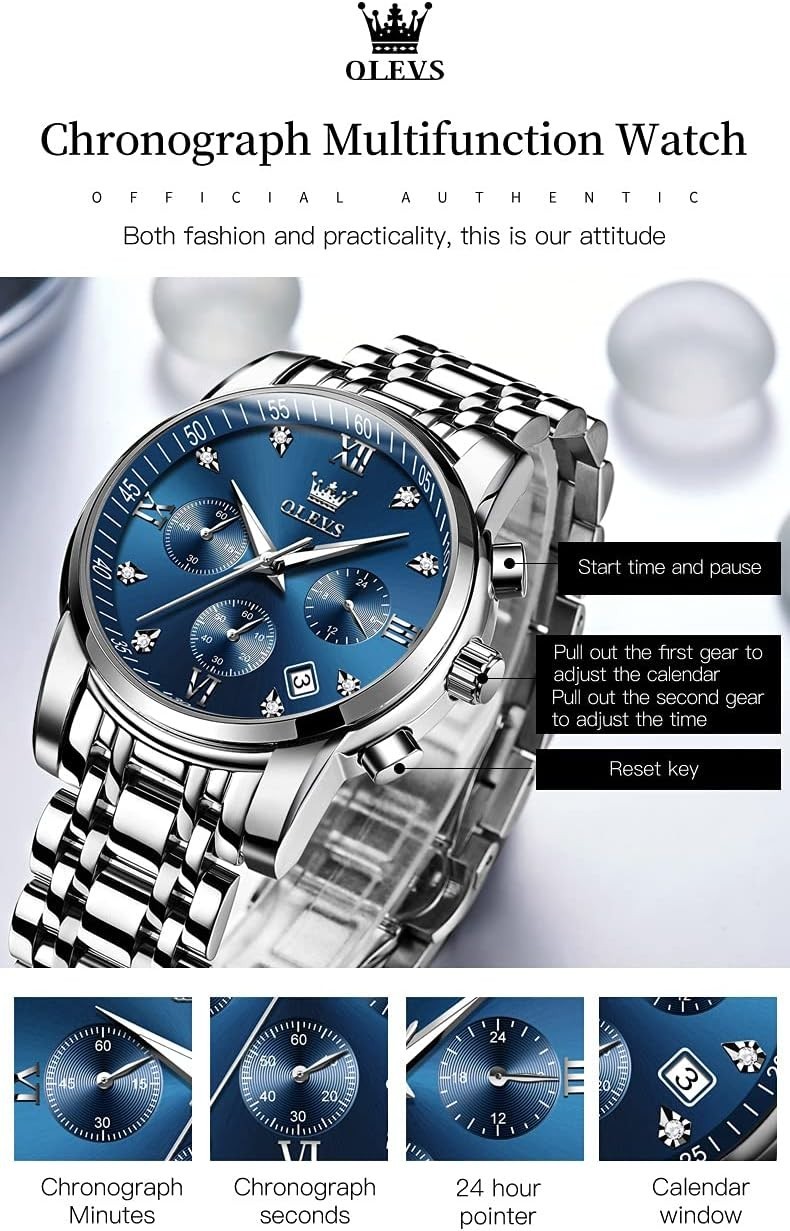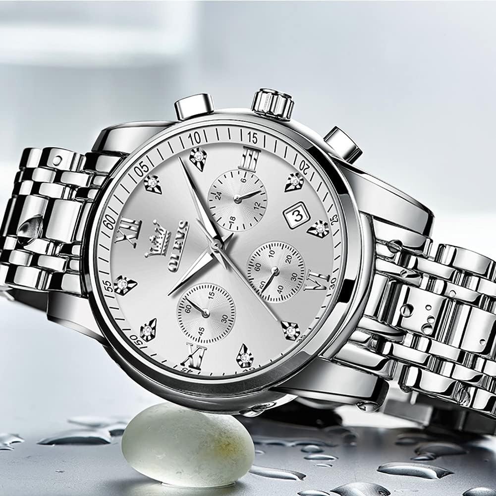 Unique Elegant Design: Features three multifunction sub-dials supporting seconds, minutes, and chronographs with a calendar function. High quality quartz movement ensures accurate timekeeping. Durable and comfortable stainless steel band is perfect for daily wear with a scratch-proof mineral glass dial.