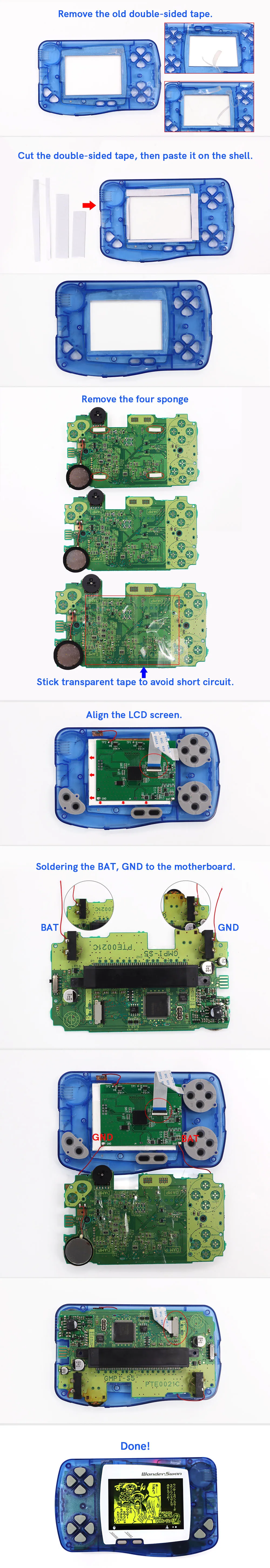 Describe: 1. Same display size as the original LCD. 2. Hightlight LCD Kit. 3. Easy to install. 4. The WS shell case no need cutting! 5. Wide View angle up to 170° 6. Touch to change the brightness.