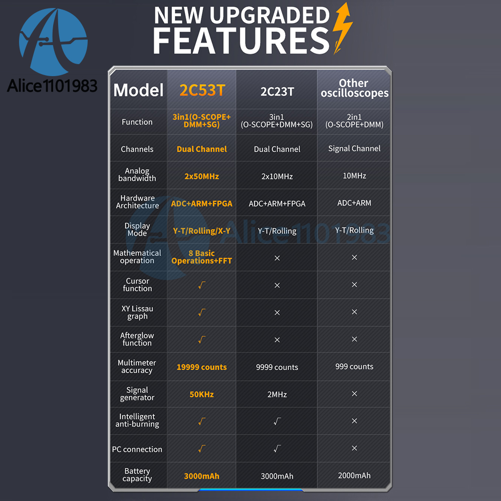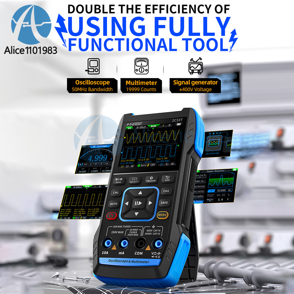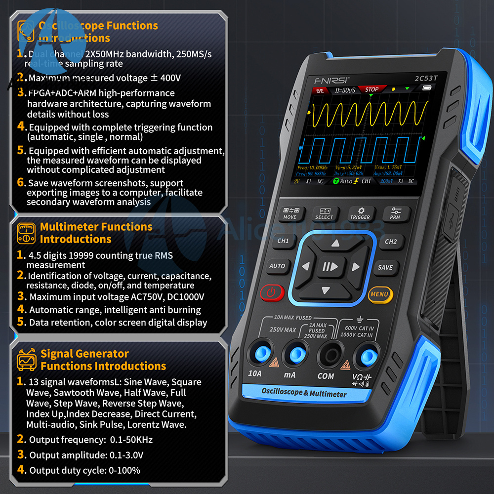 1. Multi-functional 3-in-1: Oscilloscope + Multimeter + Signal Generator in one versatile unit.2. Equipped with a 2.8-inch TFT colour screen for clear, intuitive display.3. Incorporates a high-capacity rechargeable battery (3000mAh), supporting extended standby operation for up to 10 hours.4. Waveform storage: Enables screenshot saving and viewing for convenient data analysis.5. Signal generator function: Supports 13 waveform outputs with a frequency range of 0-50kHz. Adjustable output voltage up to 3V, with configurable output parameters including frequency, amplitude, and duty cycle for versatile adaptation to diverse requirements.6. Multimeter function: Features recording mode, auto-measurement, AC/DC voltage, AC/DC current, resistance, capacitance, diode/continuity, frequency, temperature, data hold, and LIVE neutral/live wire detection. Includes overload protection and low-battery indicator.
