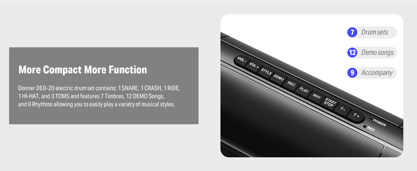 [ Fun Drum Pad Machine ] DED-20 electronic drum pad 's high-quality sound source sample is taken from a real drum source, faithfully reproducing the acoustic drum's sound. 7 drum sets(1 SNARE, 1 CRASH, 1 RIDE, 1 HI-HAT, and 3 TOMS), 12 demonstration songs, and 9 accompaniments were set up to accommodate the needs of performance and entertainment.