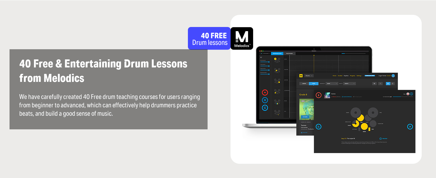 [ 40 Free and Entertaining Drum Lessons from Melodics ] We have carefully created drum teaching courses for users ranging from beginner to advanced, which can effectively help drummers practice beats, build a good sense of music, and improve learning efficiency. 40 free and entertaining courses are sufficient to master all aspects of arrangement creation. Then comes your free time to create! Remember to get the course from customer service!