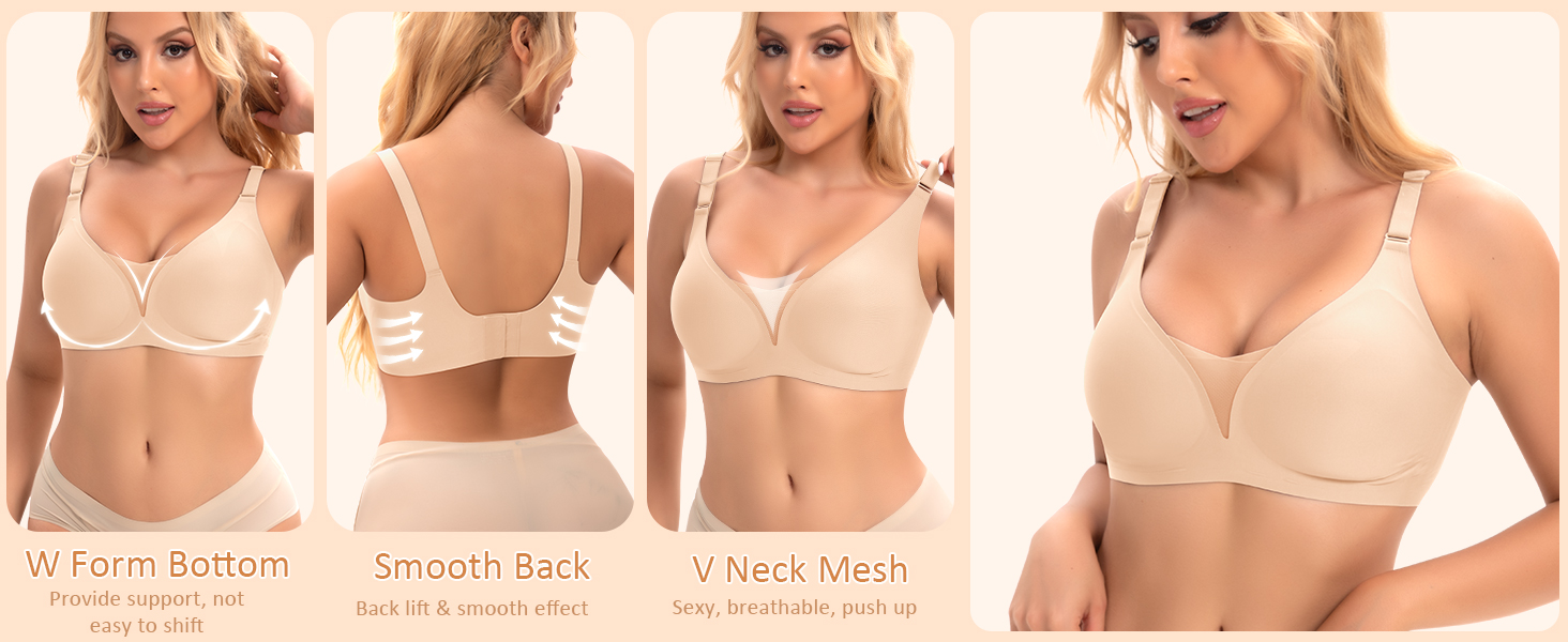 V Neck Mesh Wireless Bras - V neck mesh design can gather and lift your breasts, show the breast line and your sexy cleavage. Made from 55% Nylon & 45% Spandex, no underwire, our no wire bras for women is soft, smooth, stretch and comfortable, breathable and no odor. Our wirefree seamless bra hug your body gently, no restraint. An everyday bras that is comfy to wear it all day