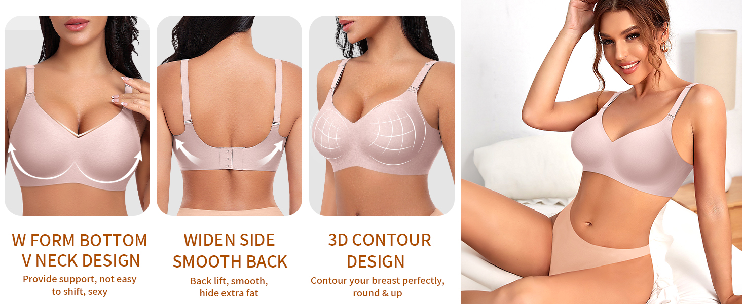 V-neck no-wire bra - V-necks are designed to draw and lift your chest, showing off your breast lines and sexy cleavage. Made of 55% nylon and 45% spandex, no steel ring, elastic, breathable, no odor. Our no-wire seamless bra is very gentle on the skin, does not compress the chest, and is free from restraints, making it a comfortable bra for women