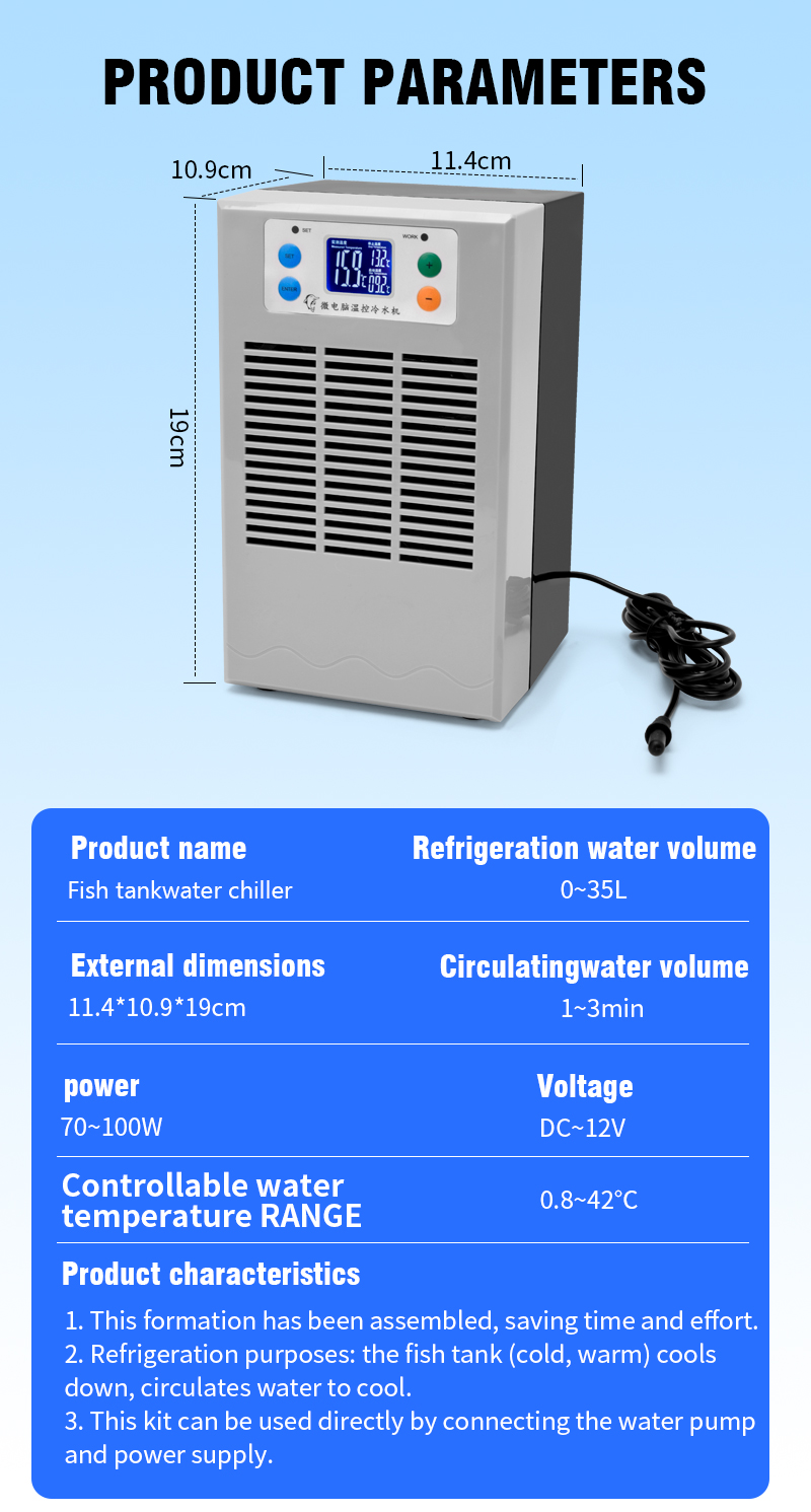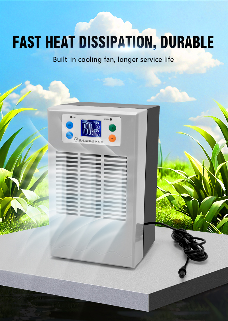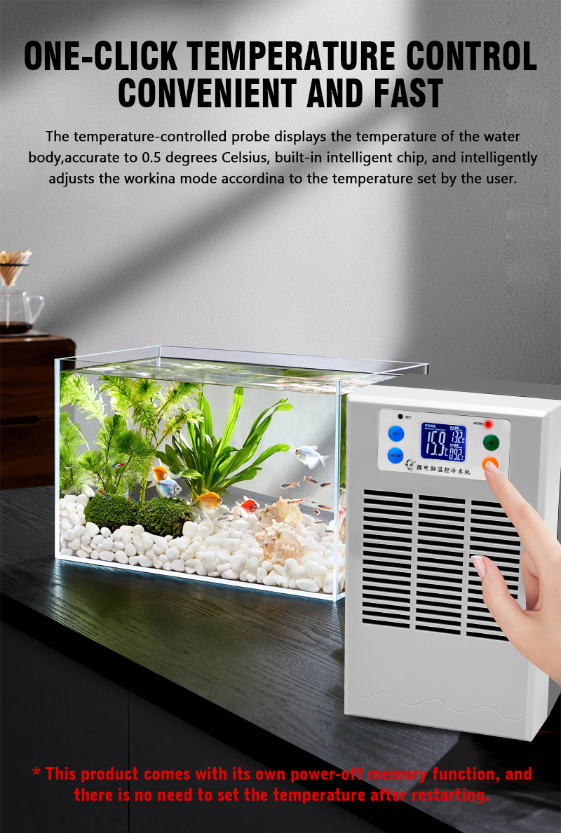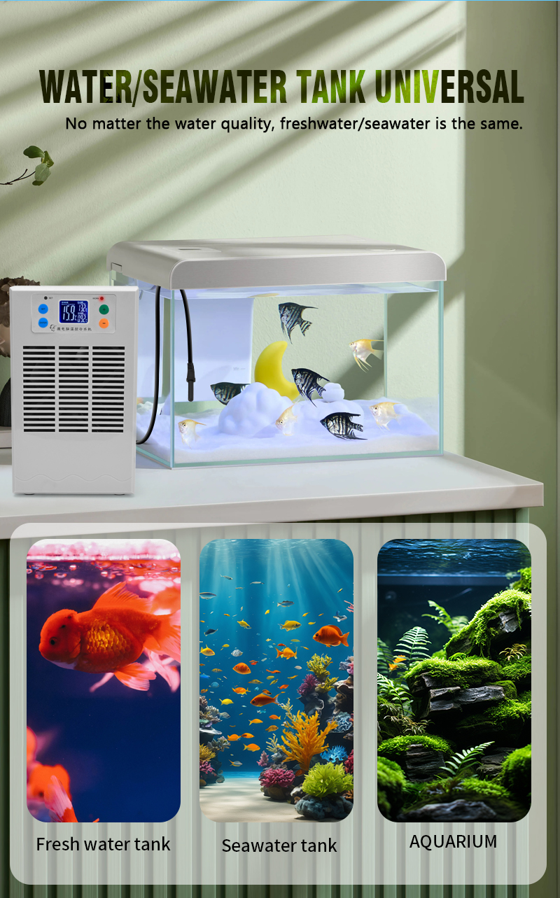 The Aquarium Chiller is a small inline chiller designed to effectively cool the water in ornamental fish tanks, with a power of 100W and a capacity of 20 liters. Made in China, this product is suitable for all water types, making it a versatile solution for maintaining the ideal water temperature for your aquatic pets. Perfect for small aquarium setups, this chiller ensures a stable and comfortable environment for your fish to thrive.