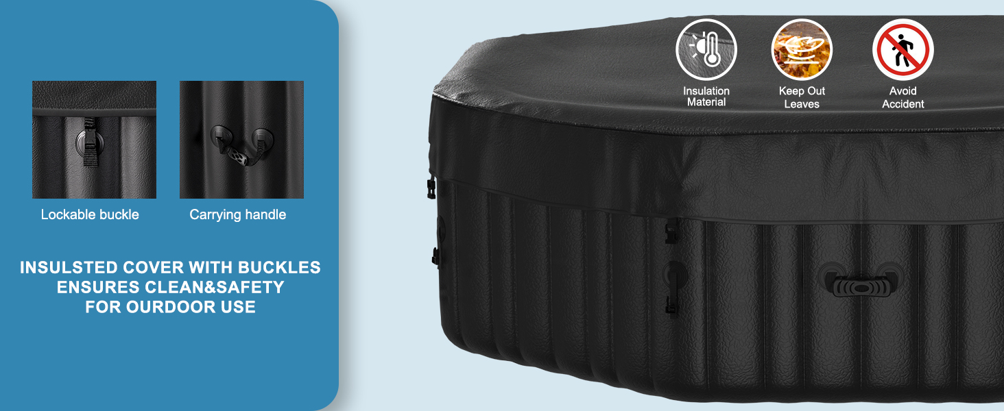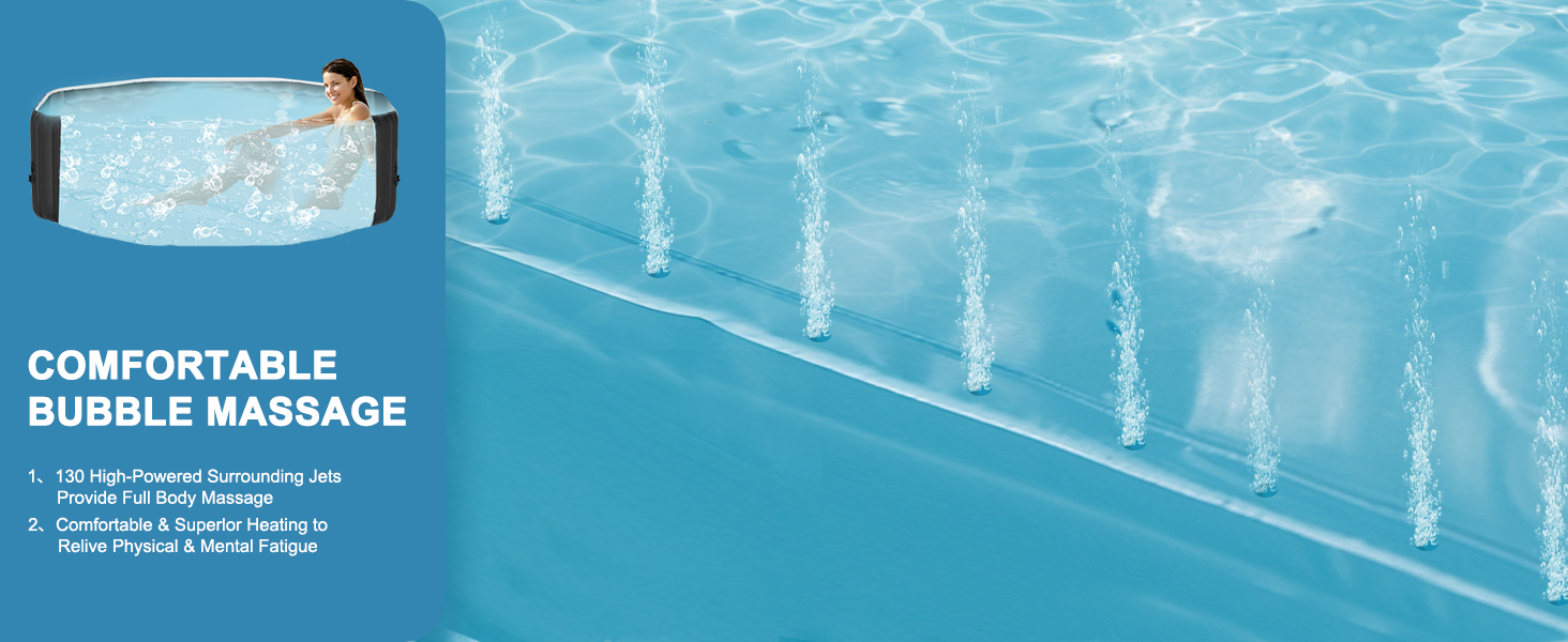 USER-FRIENDLY OPERATION - The portable hot tub has a built-in air pump that makes it easy to inflate & deflate within minutes to click the "Bubble" button. The hot tub also features auto child lock and frozen protection for peace of mind. Furthermore, it can be easily deflated and folded within minutes, simplifying storage