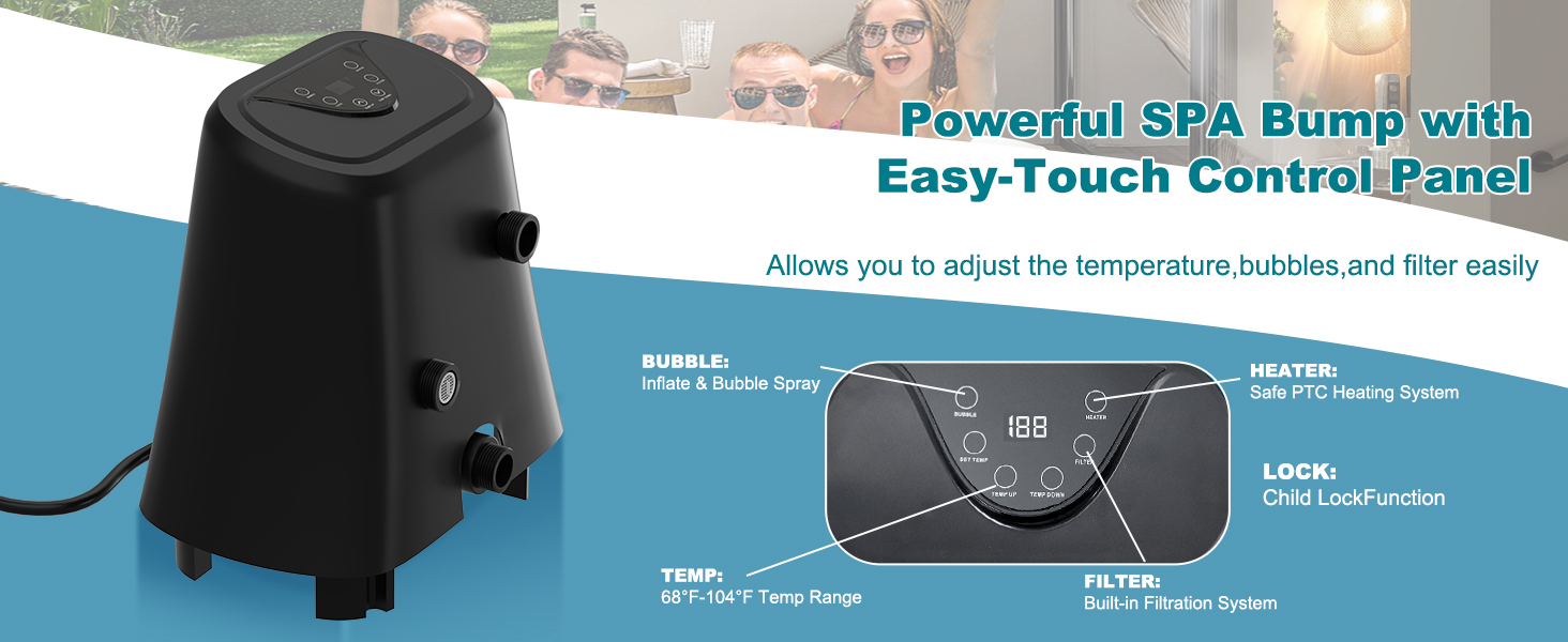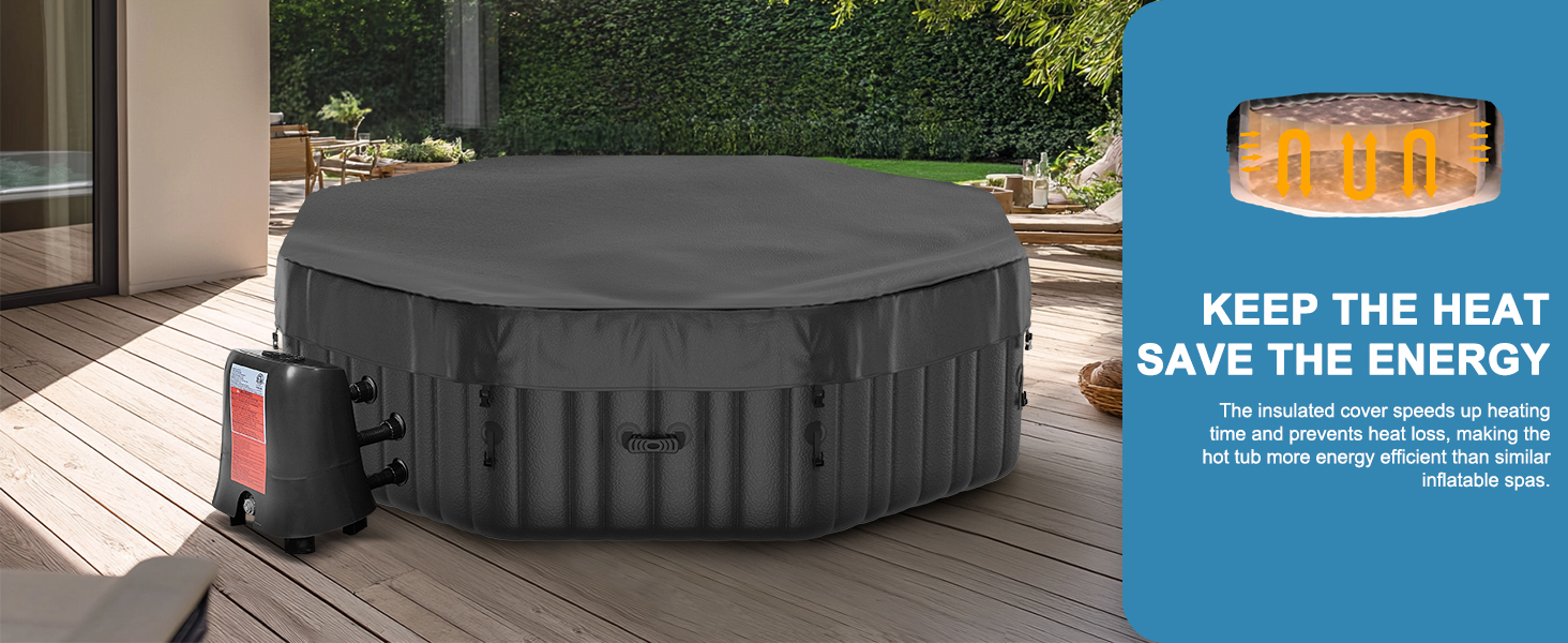 EFFICIENT HEATING SYSTEM - Featuring a PTC heating design, the hot tub's heater pump delivers a robust 1350W of heating power, raising the water temperature by 1.8-2.7℉ per hour. The SPA cover enhances heating efficiency, and once the desired temperature is reached, the thermostatic system kicks in for optimal energy management