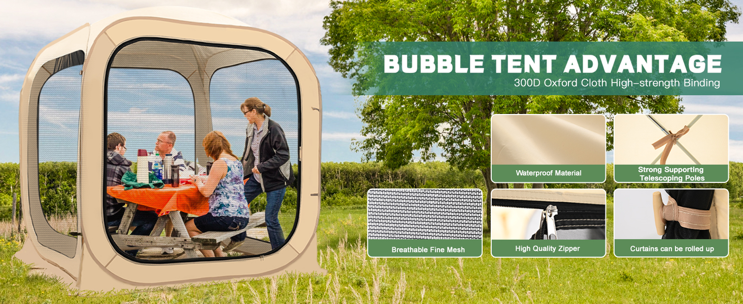Seasonal Protection: During the summer you can enjoy additional sun protection to help maintain your temperature, zippered windows and doors help with ventilation and easy access. And during the winter your new outdoor bubble tent will protect you from the wind and rain, the inside of your screen house room stays warm thanks to the excellent heat retention.