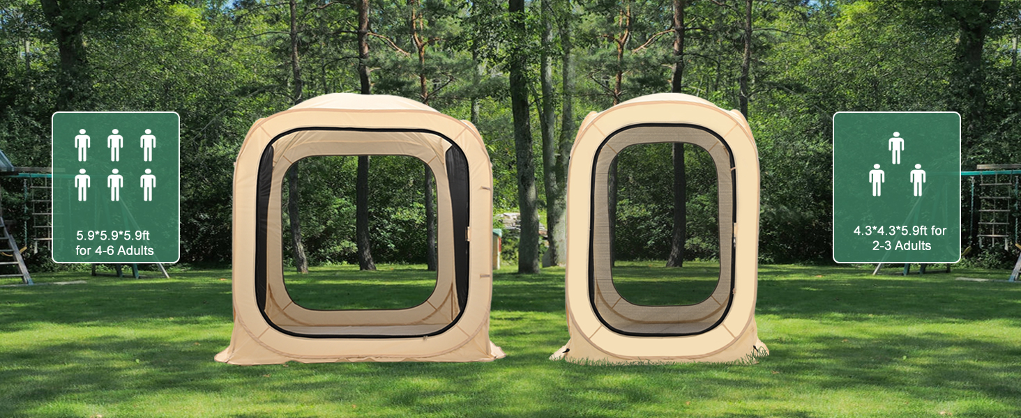 Spacious and Stable: The small tent measures length (51") x width (51") x height (71"), can provide you with a spacious and comfortable shelter for 2-3 person. The large tent measures length (71") x width (71") x height (71") fit for 4-6 adults. Instant auto set-up structure frame the tent in a stereoscopic way which provides more spacious space.