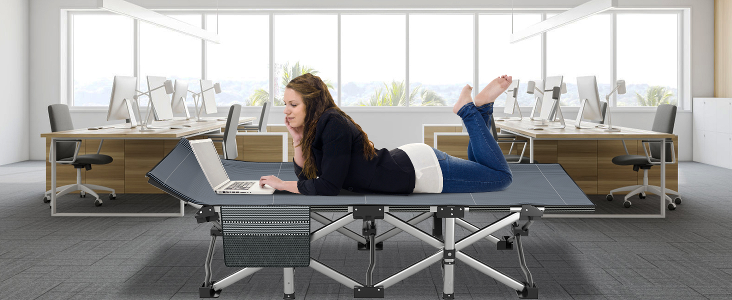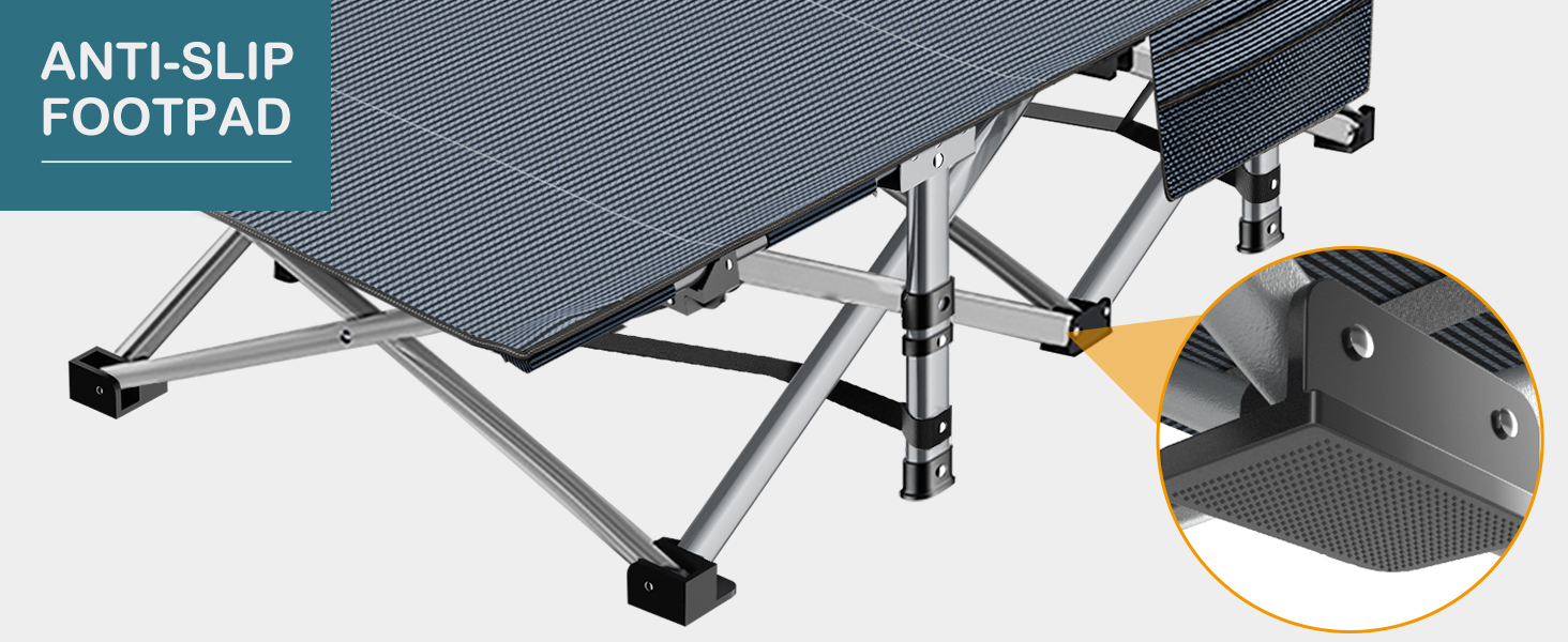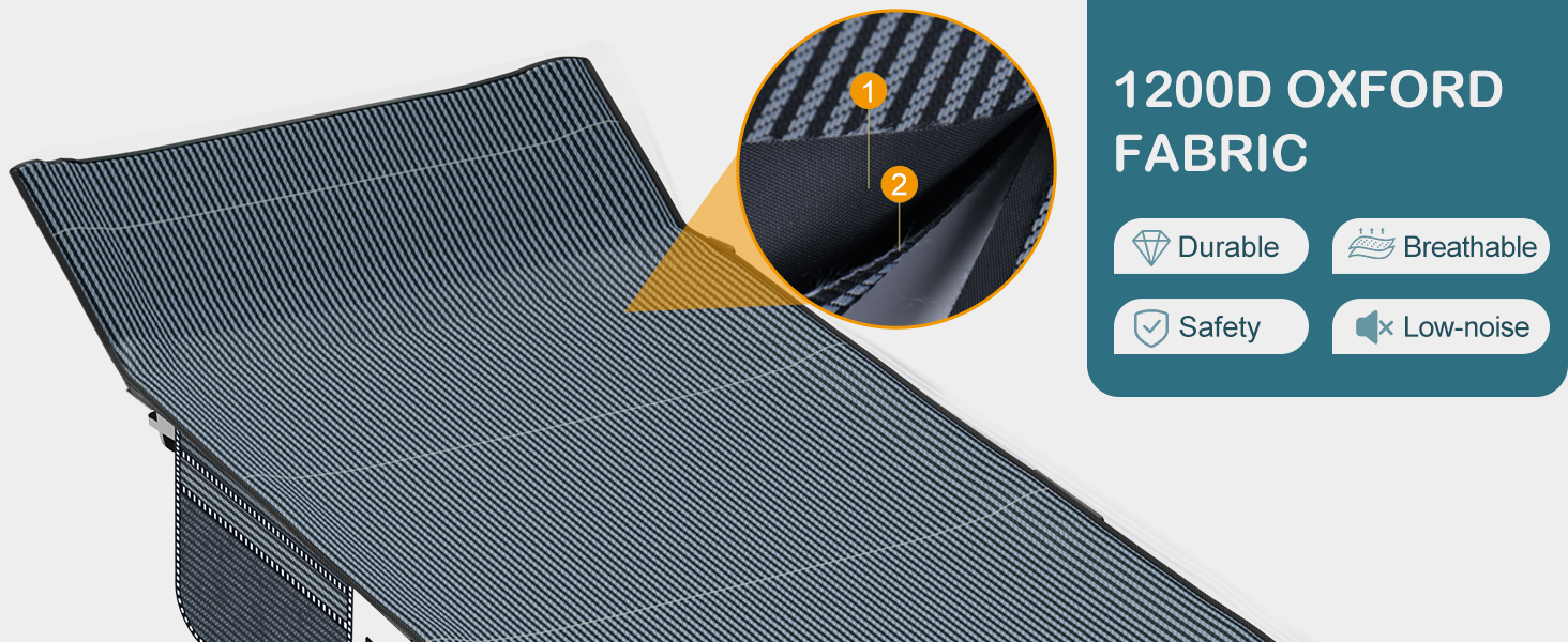 PREMIUM FABRIC-This Camping Cot is constructed in a Double Layer of 1200D oxford for Superior Strength, Water Resistance & Easy- Cleaning; Makes it more durable, can last longer time. The tilt angle of the head of the folding bed is designed to ensure that there is no more back, neck or shoulder pain!