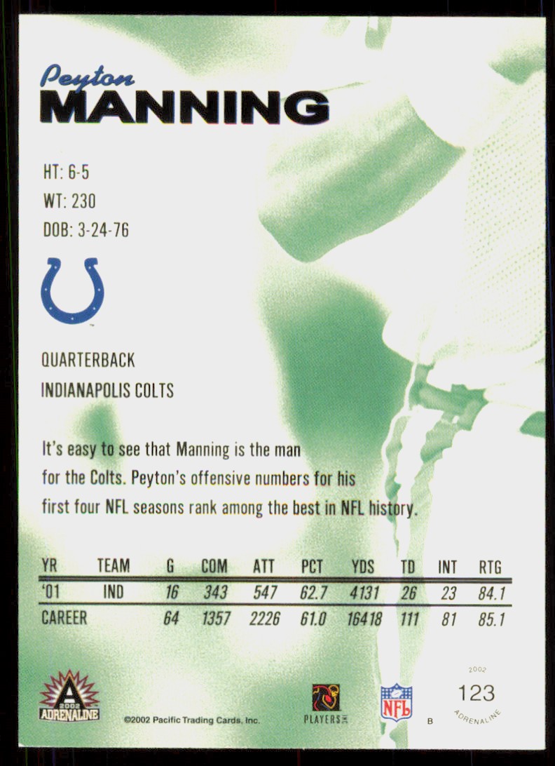2002 Pacific Adrenaline Peyton Manning Indianapolis Colts #123