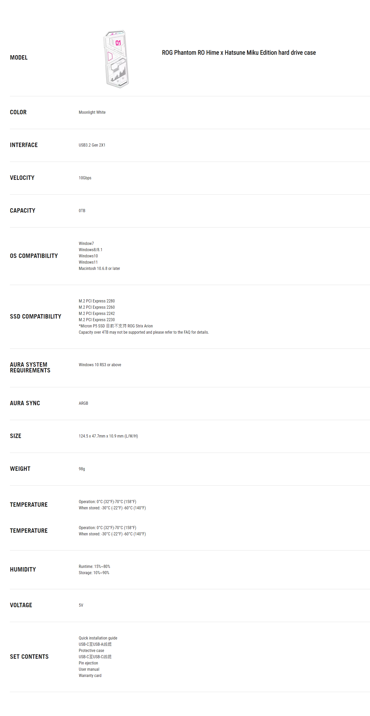 ROG Mirage RO Hime x Hatsune Miku Hard Drive Case —USB3.2 Gen 2x1 Type-C (10 Gbps), dual USB-C to C and USB-C to A cables, Screwdriver-Free, additional thermal gasket, suitable for PCIe 2280/2260/2242/2230 M key/B+M Key