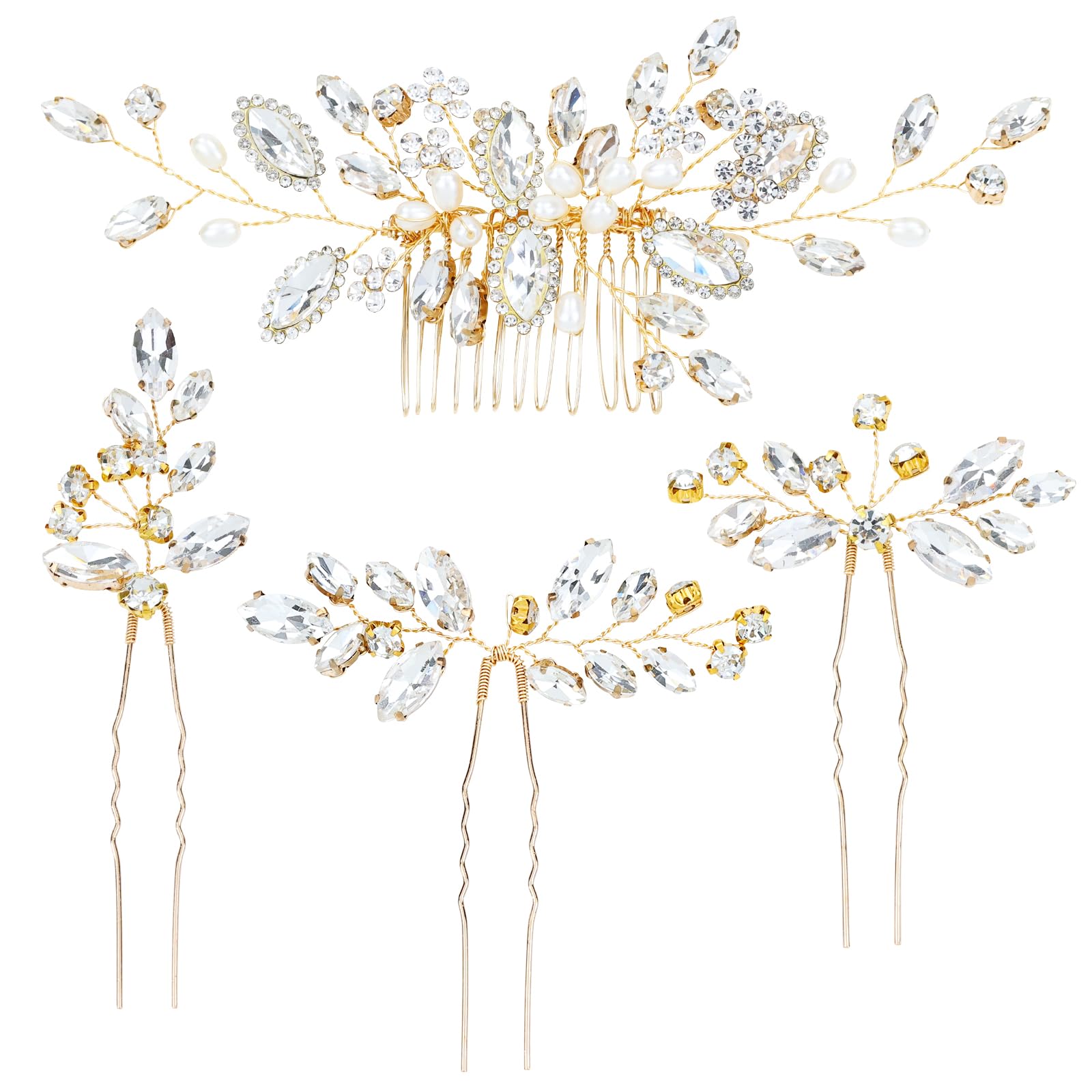 4 Pieces Gold Metal Wedding Bridal Rhinestone Hair Side Comb Slide+U-shaped Rhinestone Hair Pins Prom Party Headpieces for Brides Bridesmaids Women Girls