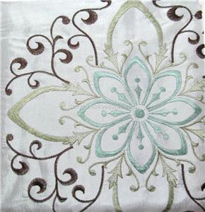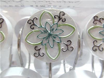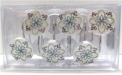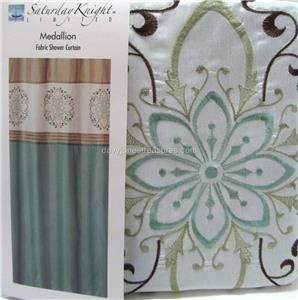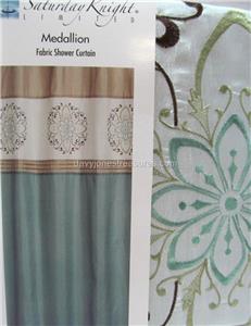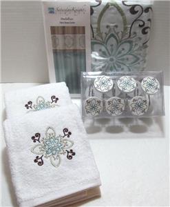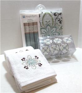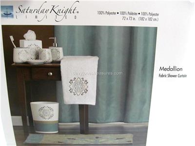 Gorgeous shimmery blue shower curtain with medallion scrolls across the top border. Matching curtain hooks and hand towels complete the set. You won't be disappointed in these pieces ~ they make a classy statement!