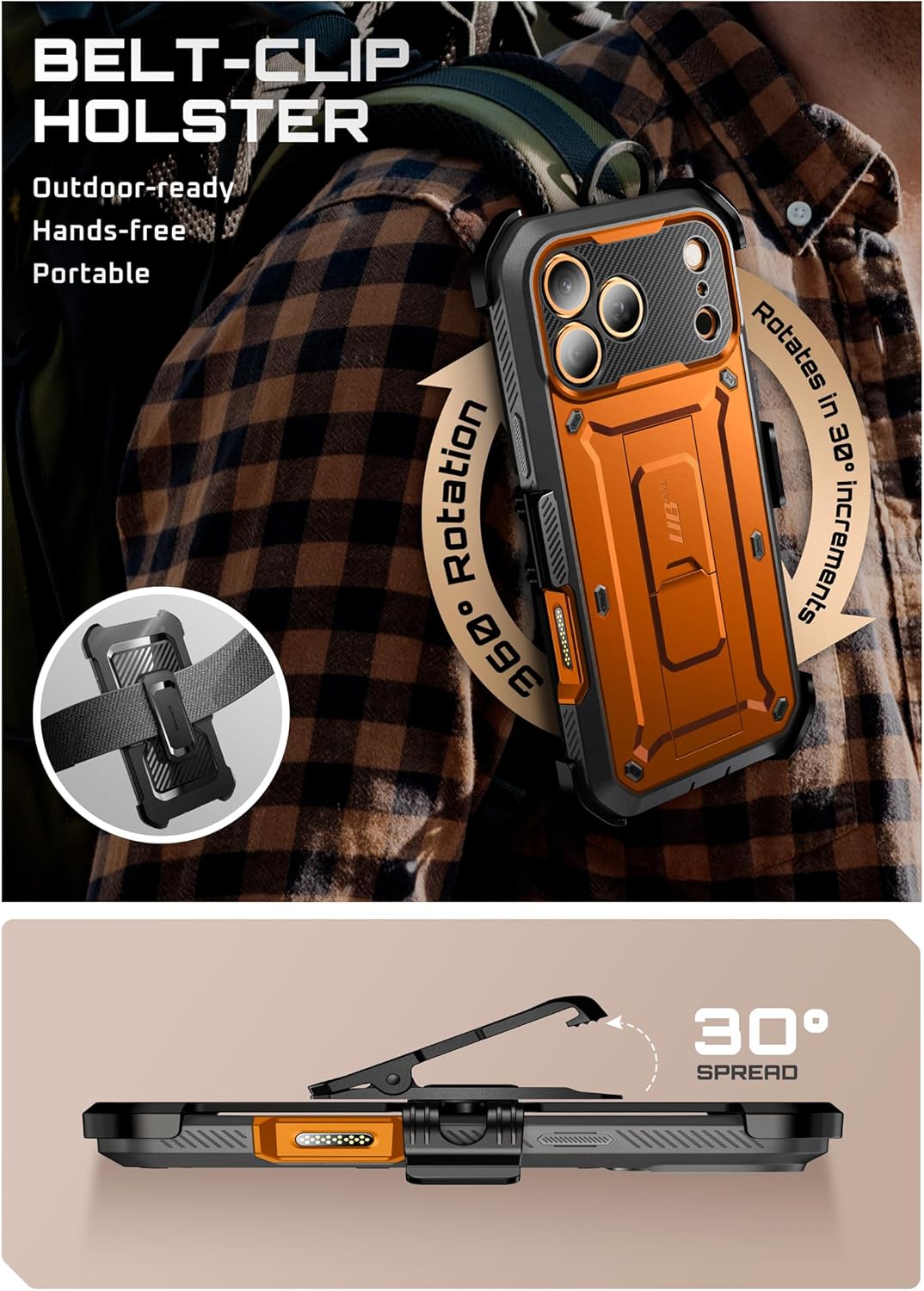 A detachable 360° belt clip is included. The fully rotating holster provides hands-free convenience, while secure side clasps let you snap the case on and off effortlessly. Ready for work, travel, and outdoor adventures.