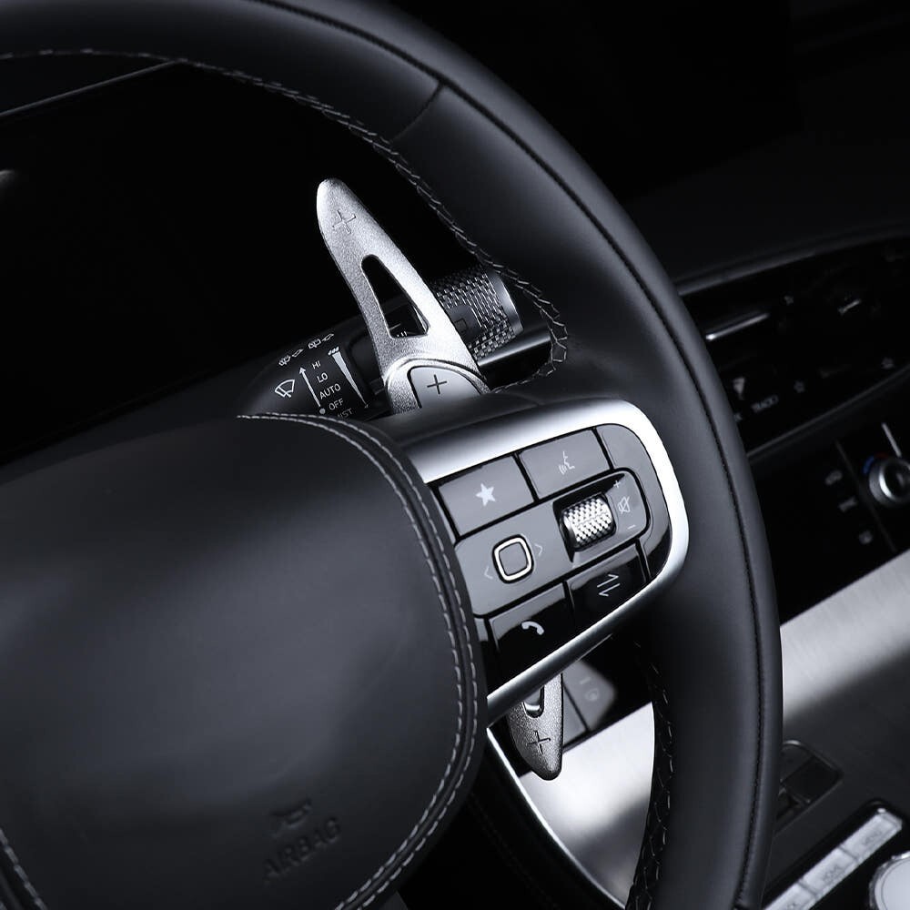This listing is for one set (+ and -) of aluminum alloy interior steering wheel shift paddles extensions decorative accessories, specially design for Genesis 2025 GV80 GV70.