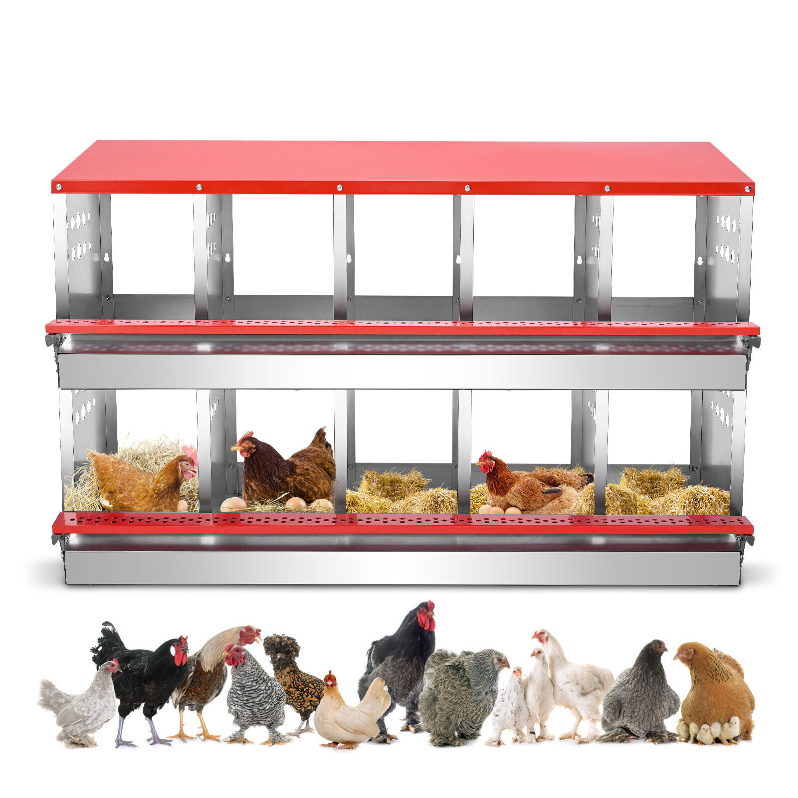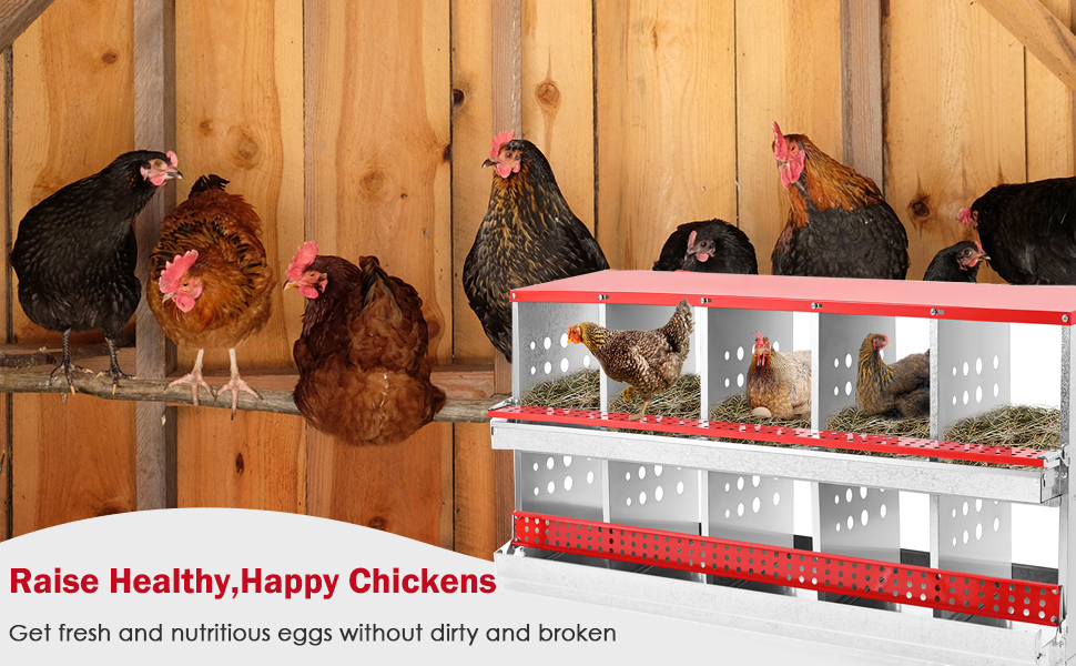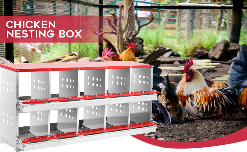 BOEASTER 10-compartment Chicken Nesting Box features 10 comfortable and spacious holes for chickens to sit and lay eggs. Crafted from rust-proof metallic materials, this nesting box is sturdy, easy to assemble, and effortless to clean, ensuring years of low-maintenance use. The upgraded design also facilitates easier egg collection, making it an excellent addition to your chicken coop.