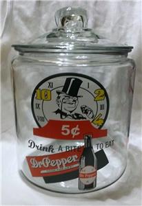 Glass Counter Jar. Jar is 10 inches tall and 7 inches wide. Jar has some wear, but no chips or cracks. Image is not a sticker it is right in the glass and will not come off. I will combine shipping but please wait until I combine before you pay or I can't. Lid does not fit tight on the Jar it is not supposed to.
