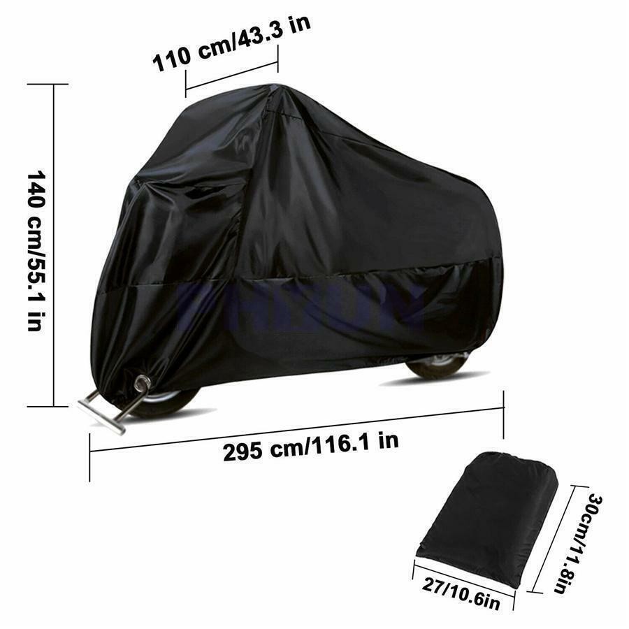 Fitment:Universal: These motor cover size is 116.1 x 43.3 x 55.1 inches (295 x 110 x 140 cm),Universal fit for motorcycle cruisers,chopper,bobber and touring model
