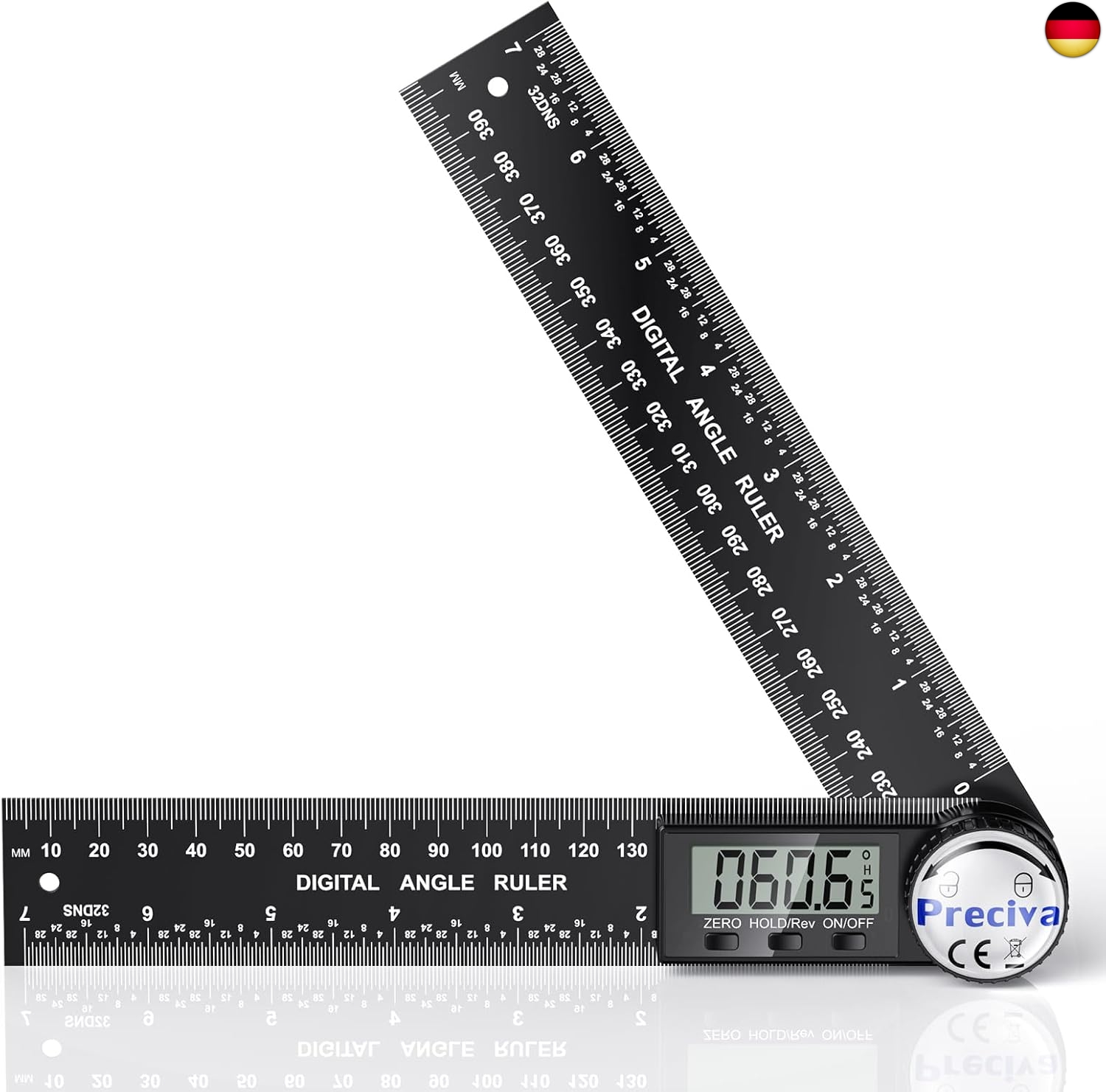 - Der digitale Winkelmesser hat eine Länge von 200mm pro Schenkel mit eingearbeiteter Messskala in Millimeter und Inch.