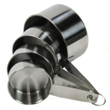 This Chef Craft 4-piece Stainless Steel Measuring Cup Set has measuring cups in 1/4 cup, 1/3 cup, 1/2 cup, and 1 cup sizes.