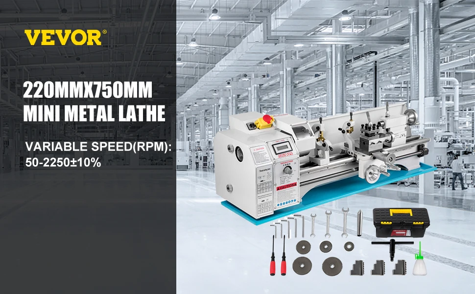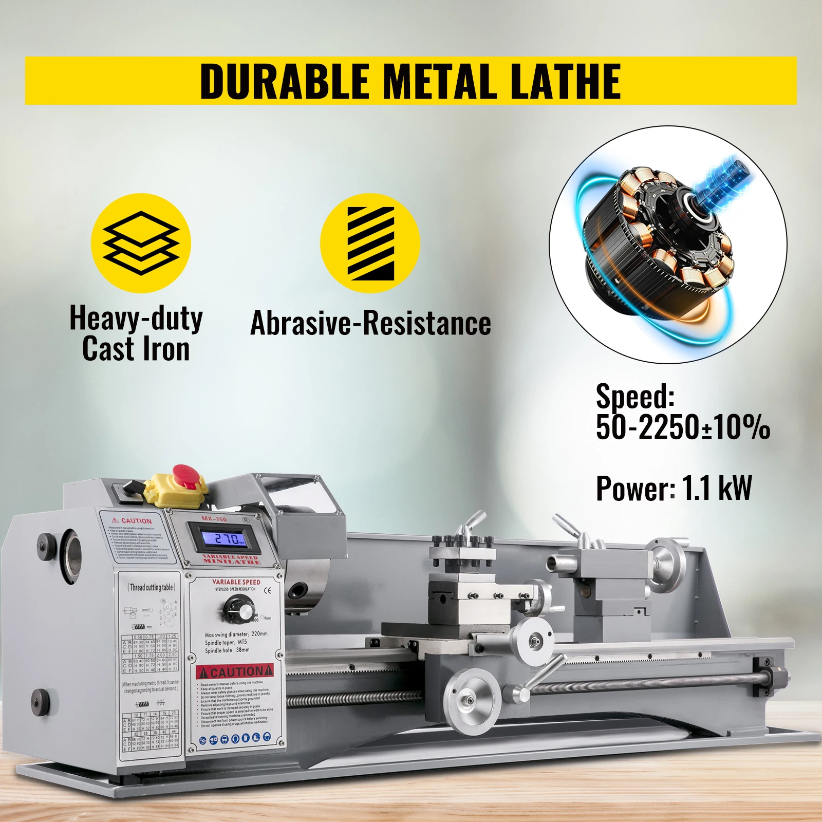 【Infinitely Variable Speed】: The mini metal lathe is driven by DC motor with Power: 750W. Variable Speed(Rpm): 50-2250±10%. Taper in Spindle Nose: MT5. LED screen shows you the clear and accurate speed for accurate working. Soft start, change-over switch for clockwise or counter-clockwise spindle rotation. Operate either manually or with the adjustable auto feed rate.
