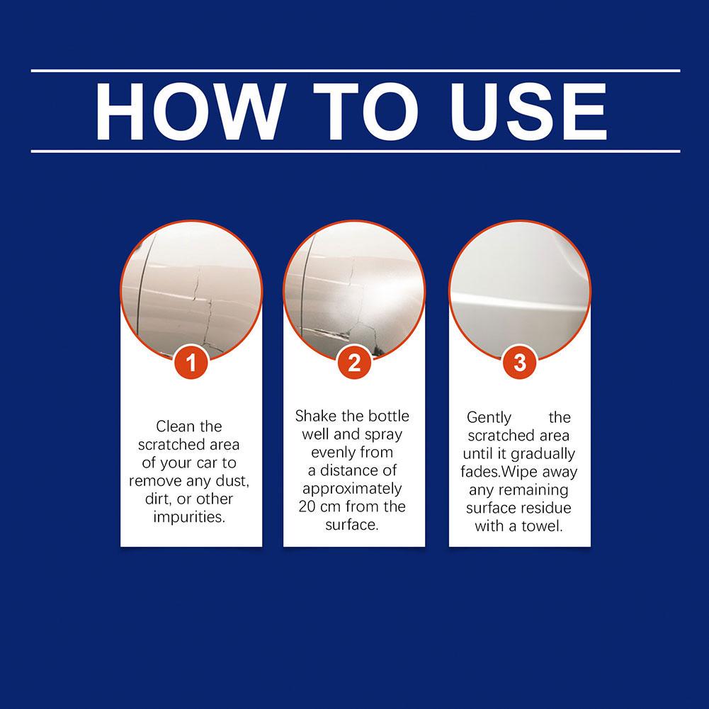 Our car scratch care spray, carefully formulated with deionized water and polytetrafluoroethylene, is designed to quickly repair small scratches in the clearcoat and restore smoothness. Easy to use: Clean the scratched area of ​​your car, removing any dust, dirt, or other impurities. Shake the bottle thoroughly and spray evenly from a distance of approximately 20 cm. Gently rub the scratched area until it disappears. Use a towel to wipe away any remaining stains. This spray will restore the original luster of the paint without damaging the original paint color.