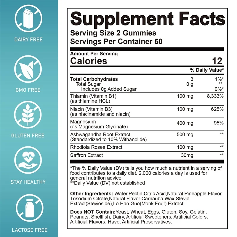 Added ashwagandha, rhodiola, saffron, vitamins B1, B3 help brain health, improve mood, support focus, reduce fatigue, and provide energy support.